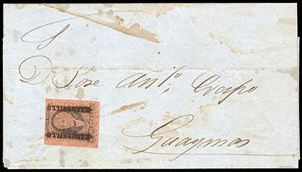 Mexico, Hermosillo 1861, 8r black on red brown. Double district overprint at sides. Margins full to a bit in at top, uncancelled on 1863 folded letter sheet; with certificate unable to render a opinion as to stamp originating on cover, F.-V.F., only 520 issued but this is the only full stamp recorded, another is known as a quadrisect (NF unpriced), with 2007 M.E.P.S.I. certificate. Scott No. 11; Estimate $1,000 - 1,500. US$1,000-1,500 (Image)