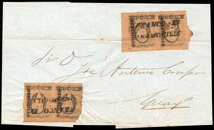 Mexico, Hermosillo, 1861, ½r black on buff, two horizontal pairs. Canceled canceled by socked-on-the-nose strikes of straight line Hermosillo handstamps (Schatzkes 541) on 1861 folded letter sheet to Guadalajara; horizontal file fold affecting top pair, otherwise Very Fine, a rare multiple usage, with only 576 issued (NF $1,200 for off cover singles), with 2007 M.E.P.S.I. certificate. Scott No. 6; Estimate $1,000 - 1,500.