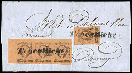 Mexico, Lagos 1861, ½r black on buff, left margin horizontal strip of three and single. Wide margins, canceled and tied by straight line Teocaltiche handstamps (Schatzkes 688) on 1861 folded letter sheet to Durango, Very Fine and choice, with only 612 issued (NF $3,000 for off cover singles), with 2024 M.E.P.S.I. certificate. Scott No. 6; Estimate $2,500 - 3,500.