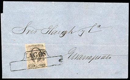 A REMARKABLE MULTIPLE USAGE OF THE 1861 ½R ISSUE OF LAGOS USED IN TEOCALTICHE. US$2,500-3,500 (Image)