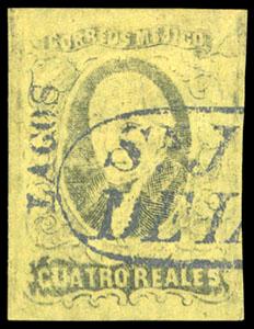 Mexico, Lagos, 1861, 4r black on yellow. Oval San Juan de los Lagos cancel (Schatzkes 6760, Very Fine and attractive (N.F. $300). Scott No. 9; Estimate $200 - 300. US$200-300 (Image)