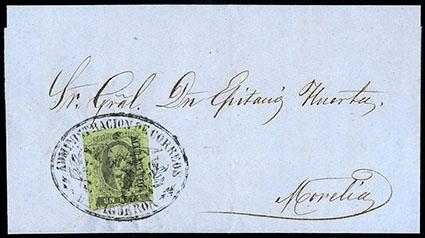 Mexico, Maravatio 1861, 1r black on green. Mostly large margins, tied by socked-on-the-nose strike of fancy Figueroa eagle cachet handstamp (Schatzkes 723) on fresh folded letter sheet to Moreila, Very Fine and attractive,ex-Mazepa, with 2024 M.E.P.S.I. certificate. Scott No. 7; Estimate $400 - 600. US$400-600 (Image)
