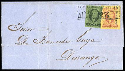 Mexico, Mazatlan 1861, 4r dull rose on yellow. Large to huge margins, in combination with 1861, 1r black on green on 1863 folded letter sheet to Durango, tied by full strike of Mazatlan boxed date stamp (Schatzkes 739), Very Fine, 4r with only 866 issued (NF $310), with 2024 M.E.P.S.I. certificate. Scott No. 10, 7; Estimate $250 - 350. US$250-350 (Image)