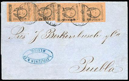 Mexico, Mexico, 1861, ½r black on buff, four singles. Tied by Mexico cds's (Schatzkes 821) on 1862 folded letter sheet to Puebla, Very Fine, a scarce use of the ½r making up the 2r rate. Scott No. 6; Estimate $300 - 400. US$300-400 (Image)