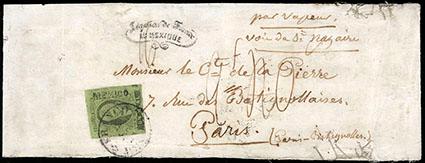 Mexico, Mexico, 1861, 1r black on green. Tied by Mexico cds on lined lined rare diplomatic wrapper band to Paris, France paying the printed matter rate for 2 pounds (probably contained newspapers), Mexican French Delegation cachet handstamp, backstamped with "Mexique-Tampico May 1863" transit date stamp, rated "2f 40c" and "16" (indicating 16 times the 16 times the 15c per ounce rate); light soiling, still Very Fine, with 2024 M.E.P.S.I. certificate. Scott No. 7; Estimate $2,000 - 3,000. US$2,000-3,000 (Image)