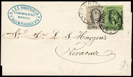 Mexico, Mexico, 1861, 1r black on green. In combination with 1861, 2r black on green, Mexico on 1863 folded letter sheet to Veracruz, with blue cachet of the well-known Mexico city store "La Sorpresa", Very Fine and attractive. Scott No. 7, 8; Estimate $100 - 150. US$100-150 (Image)