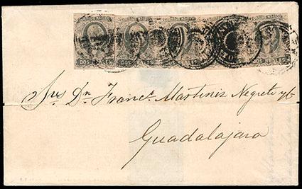 Mexico, Mexico, 1861, 2r black on pink, horizontal strip of four & single. On 1864 folded letter sheet to Guadalajara, letter was written on Mexico and carried out-of-the-mails to Guanajuato where it entered the mails, all tied by negative Guanajuato circular handstamps (Schatzkes 480); cover with tears along horizontal file fold at sides, otherwise Very Fine, with 1998 M.E.P.S.I. certificate. Scott No. 8; Estimate $1,000 - 1,500. US$1,000-1,500 (Image)