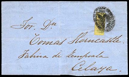 Mexico, Mexico, 1861, 4r black on yellow, vertical bisect. Left potion of stamp tied by bold Mexico "Diligencias Generales" eagle oval handstamp (Schatzkes 829) on 1863 folded letter to Celaya, Very Fine,ex-A. Rubio, with 1972 M.E.P.S.I. certificate. Scott No. 9a; Estimate $1,500 - 2,000.