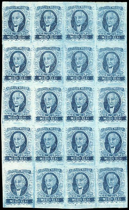Mexico, 1856, First Issue, ½r blue, without district overprint. Block of 20, o.g., margins mostly large to touching a couple stamps, fresh with bold color; vertical crease between 3rd and 4th row, Very Fine, an impressive mint multiple, multiples of any first issue are scarce (NF $1,740). Scott No. 1b; Estimate $750 - 1,000. US$750-1,000 (Image)