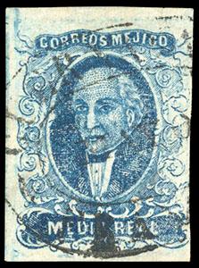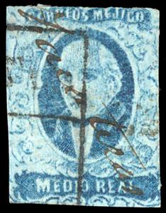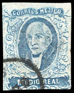 Mexico, 1856, First Issue, ½r blue, without district overprint (Polotitlan). Oval Polotitlan date stamp cancel (Schatzkes 1145), clear margins, F.-V.F., extremely rare from the very short only direct shipment (N.F. $1,250), with 2003 M.E.P.S.I. certificate. Scott No. 1b; Estimate $500 - 750. US$500-750 (Image)