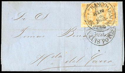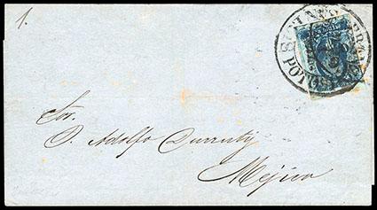 Mexico, 1856, First Issue, ½r blue, San Luis Potosi.postal fraud usage with stamp previous canceled by indistinct circular town cancel, tied by 1857 circular San Luis Potosi date stamp (Schatzkes 1443) paying the circular rate to Mexico, Very Fine. Scott No. 1; Estimate $200 - 300. US$200-300 (Image)
