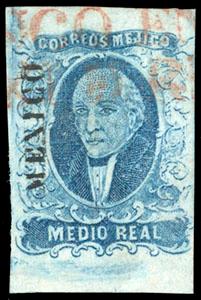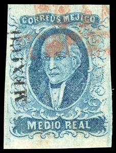 Mexico, 1856, First Issue, ½r blue (Tepeji del Rio). With "Mexico" district name, red two-line Tepeji del Rio cancel (Schatzkes 1617), clear to huge margins, Very Fine (N.F. $600). Scott No. 1; Estimate $400 - 600. US$400-600 (Image)