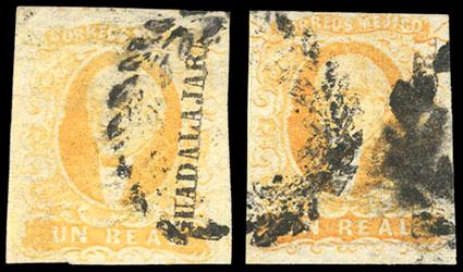 Mexico, 1856, First Issue, 1r yellow, Guadalajara. Two singles used provisionally in 1867-8, placed together showing virtually complete Wreath cancel (Schatzkes 298), F.-V.F. Scott No. 2; Estimate $150 - 200. US$150-200 (Image)
