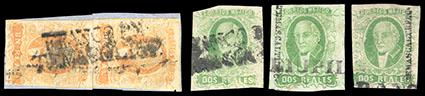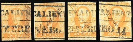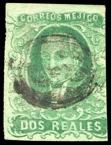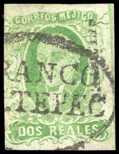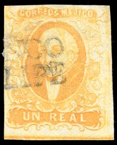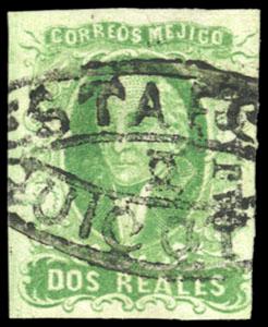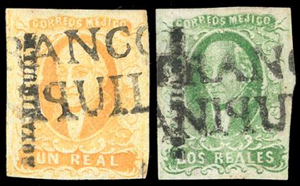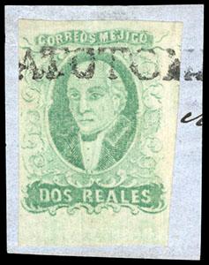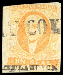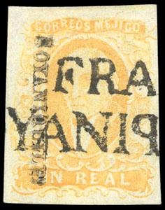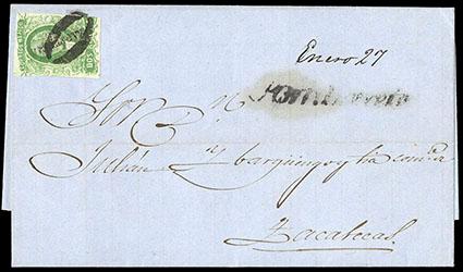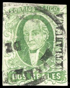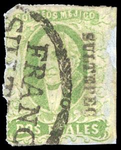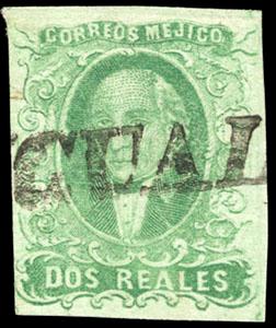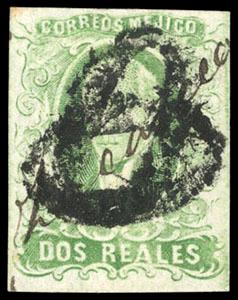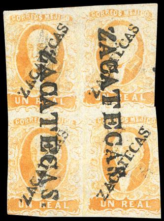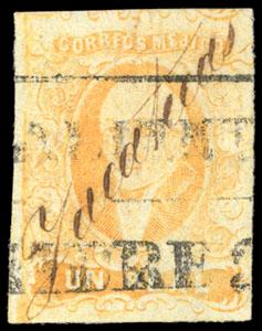 During the Civil War, from November 3, 1858 to November 30, 1858, the Zacatecas Postmaster moved to Aguascalientes, Sub-Office of the District, and due to the fact that handstamp device was lost, the Postmaster overprinted the stamps by hand, giving origin to the Zacatecas Manuscripts. US$500-750 (Image)