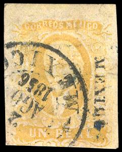 Mexico, 1856, First Issue, 1r yellow (Mexico). Clearly canceled "Mexico, August 2, 1856" Second Day of Issue circular date stamp cancel, wide margins; light crease, Very Fine appearance, with 2024 M.E.P.S.I. certificate. Scott No. 2; Estimate $400 - 600. US$400-600 (Image)