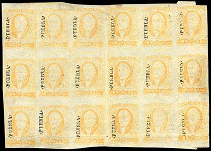 Mexico, 1856, First Issue, 1r yellow, Puebla. Block of 18, o.g., full irregular margins, central vertical crease between stamps, F.-V.F. Scott No. 2; $450; Estimate $600 - 800. US$600-800 (Image)