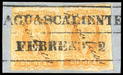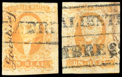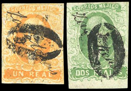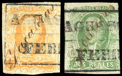 Mexico, 1856, First Issue, 1r yellow & 2r yellow green, Zacatecas.manuscript district overprint reading diagonally upwards left to right, Aguascalientes boxed date stamp cancels (Schatzkes 1928); 1r with some creasing, F.-V.F., still an attractive matched pair (N.F. $400). Scott No. 2-3; Estimate $150 - 200. US$150-200 (Image)