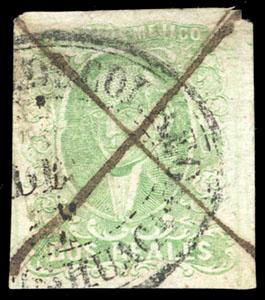 Mexico, 1856, First Issue, 2r yellow green, without district overprint, Yguala. Negative script "Y" in oval cancel (Schatzkes 221C), bit in at right, Fine and rare (N.F. $2,500). Scott No. 3d; Estimate $200 - 300. US$200-300 (Image)