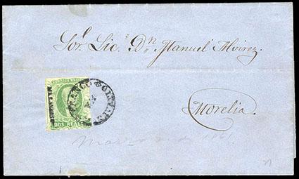 Mexico, 1856, First Issue, 2r yellow green, Maravatio. Tied by circular Maravatio handstamp (Schatzkes 712) on 1861 folded letter to Morelia, Very Fine. Scott No. 3; Estimate $150 - 200. US$150-200 (Image)