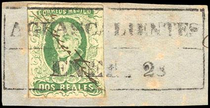 Mexico, 1856, First Issue, 2r emerald, without district overprint (Pachuca). Tied on piece by straightline Atotonilco el Grande cancel (Schatzkes 1125 - 50 points), Very Fine, quite scarce without the district overprint, ex-Larranaga. Scott No. 3f; Estimate $150 - 200. US$150-200 (Image)
