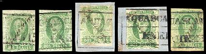 Mexico, 1856, First Issue, 2r yellow green, Zacatecas.manuscript district overprint on five singles, two showing different handwriting, others showing different configuration of overprint, Aguascalientes boxed date stamp cancels (Schatzkes 1928), generally F.-V.F. or better (N.F. $750). Scott No. 3; Estimate $300 - 400. US$300-400 (Image)