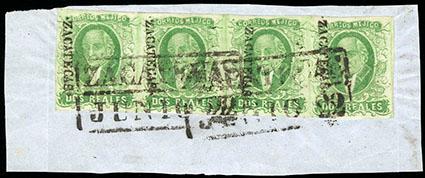 Mexico, 1856, First Issue, 2r yellow green, Zacatecas. Horizontal strip of 4, tied on piece by boxed Zacatecas date stamp cancel (Schatzkes 1851), full margins, Very Fine and choice, a very scarce multiple, ex-Quast. Scott No. 3; Estimate $250 - 350. US$250-350 (Image)