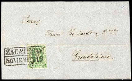 Mexico, 1856, First Issue, 2r yellow green, Zacatecas. Provisional manuscript district diagonally reading upward left to right, tied by "Zacatecas, Noviembre 19" boxed date stamp (Schatzkes 1851) on 1858 docketed folded letter sheet to Guadalajara; stamp with margin tears from horizontal file fold, Very Fine appearance, a rare usage during the transition of the Zacatecas Postmaster move to Aguascalientes. Scott No. 3; Estimate $500 - 750.