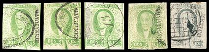 Mexico, 1856, First Issue, 2r yellow green, progressive major plate crack. Four singles showing crack extending into value tablet at bottom and eventually into bottom of portrait design, various district and town cancels, includes a second issue single showing even later stage of crack, one stamp with small internal hole, F.-V.F. overall. Scott No. 3 var.; Estimate $250 - 350. US$250-350 (Image)
