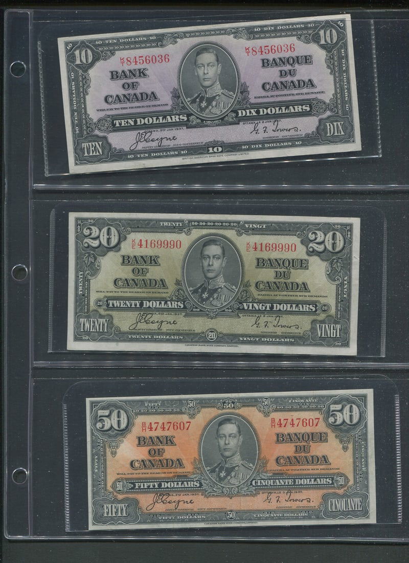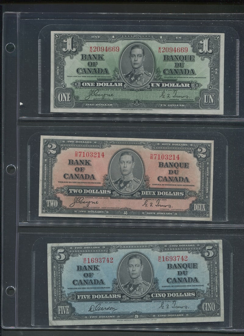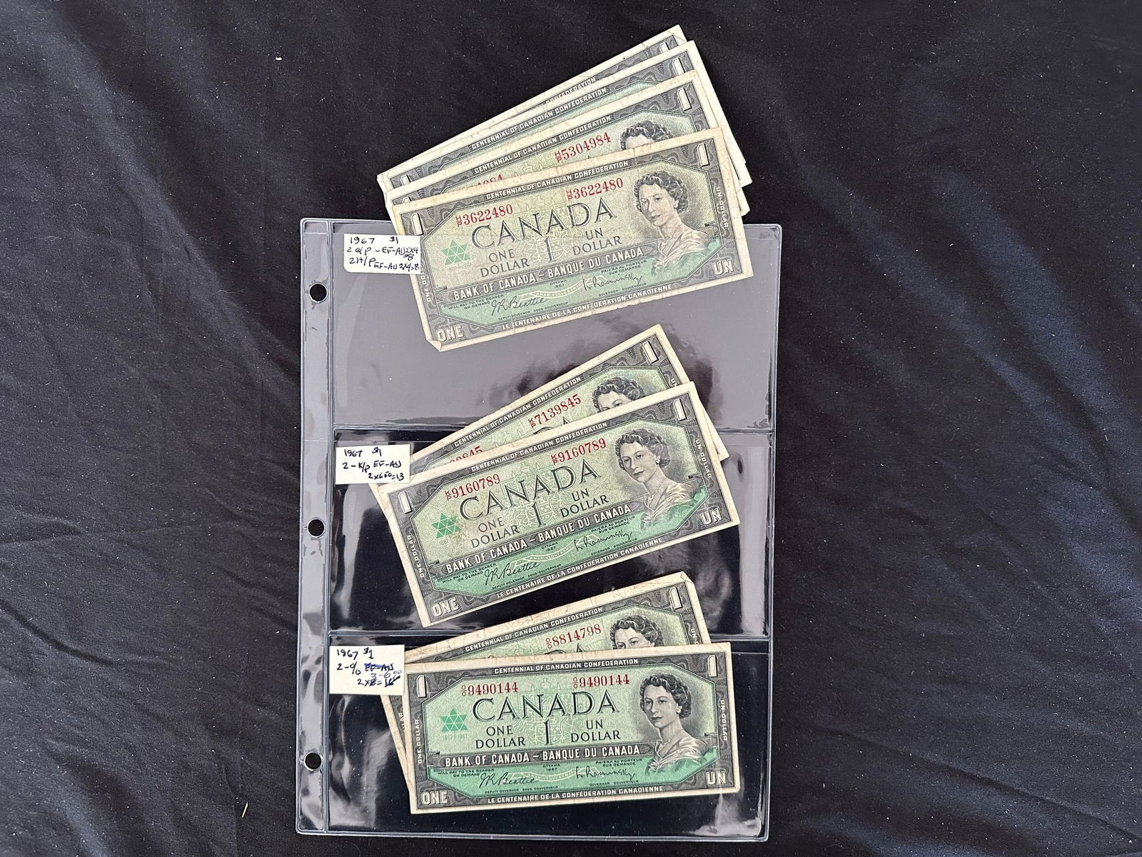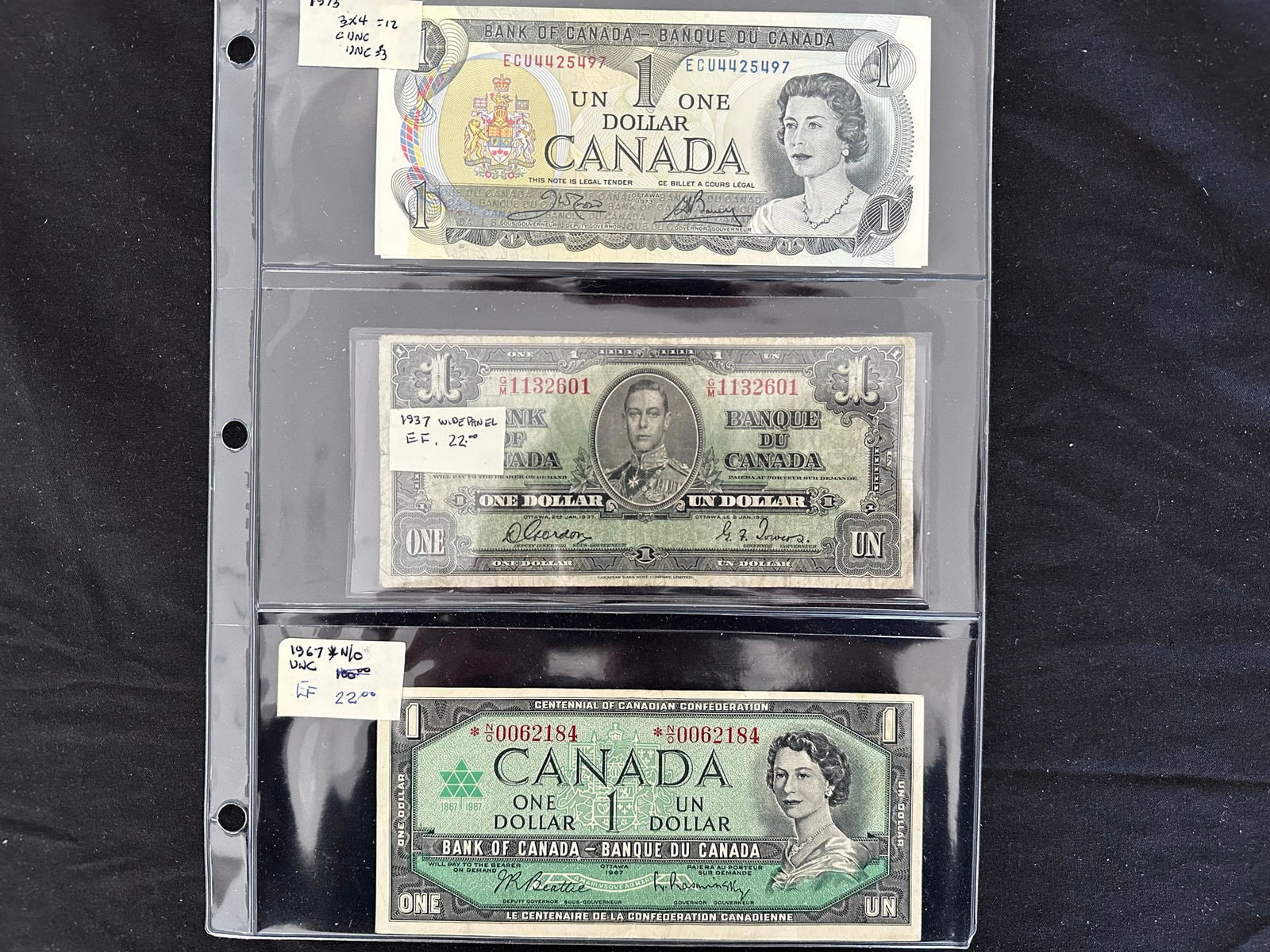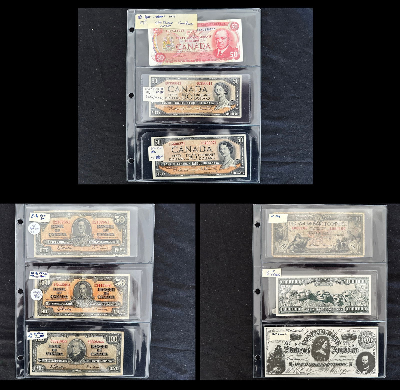 A broad range of Canadian Bank notes, including 40 Gem uncirculated 1967 confederate notes in the Gem 67/68 category, 1973 (4(9 more 1067 VF/XF, 1937 $2.00 VF/XF, 1986 (6), 1974 $2,00, 1937 $2.00 (grades from VF-AU),1986 $5.00 XF, 1937 $10.00 (5 notes grades from VF-EF), 1937 )9 notes, grades Fine to EF),1975 $50.00 VF, 1954 $50.00 ( 2 notes VF and XF), 1927 $100.00 VF),1935 CIBC Fine, Replica Confederate note, and a "fantasy 1,000,000 note. Face value alone is $500.00 USD (Image 1)