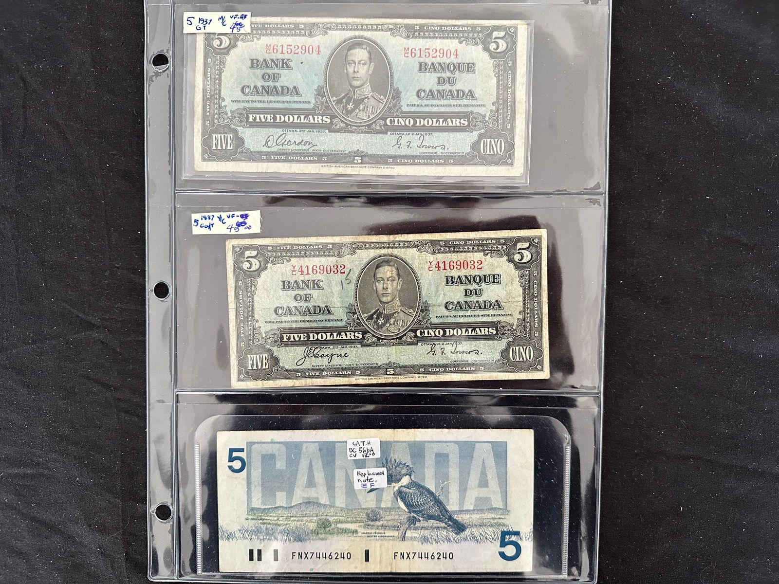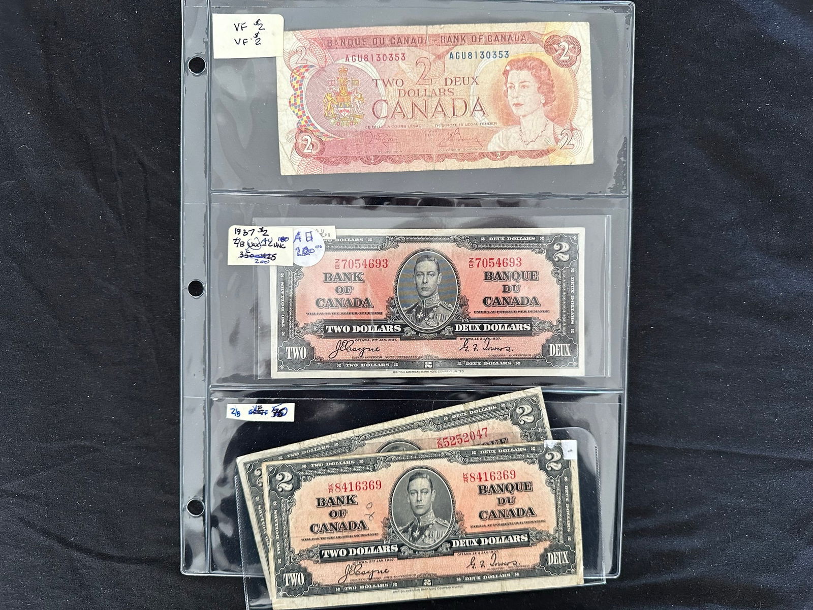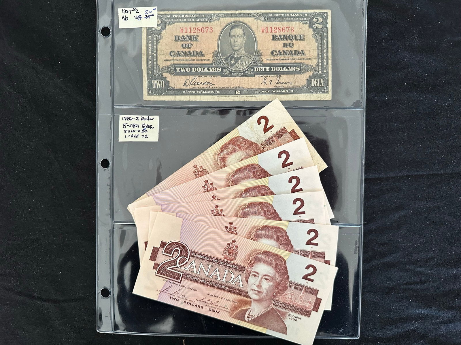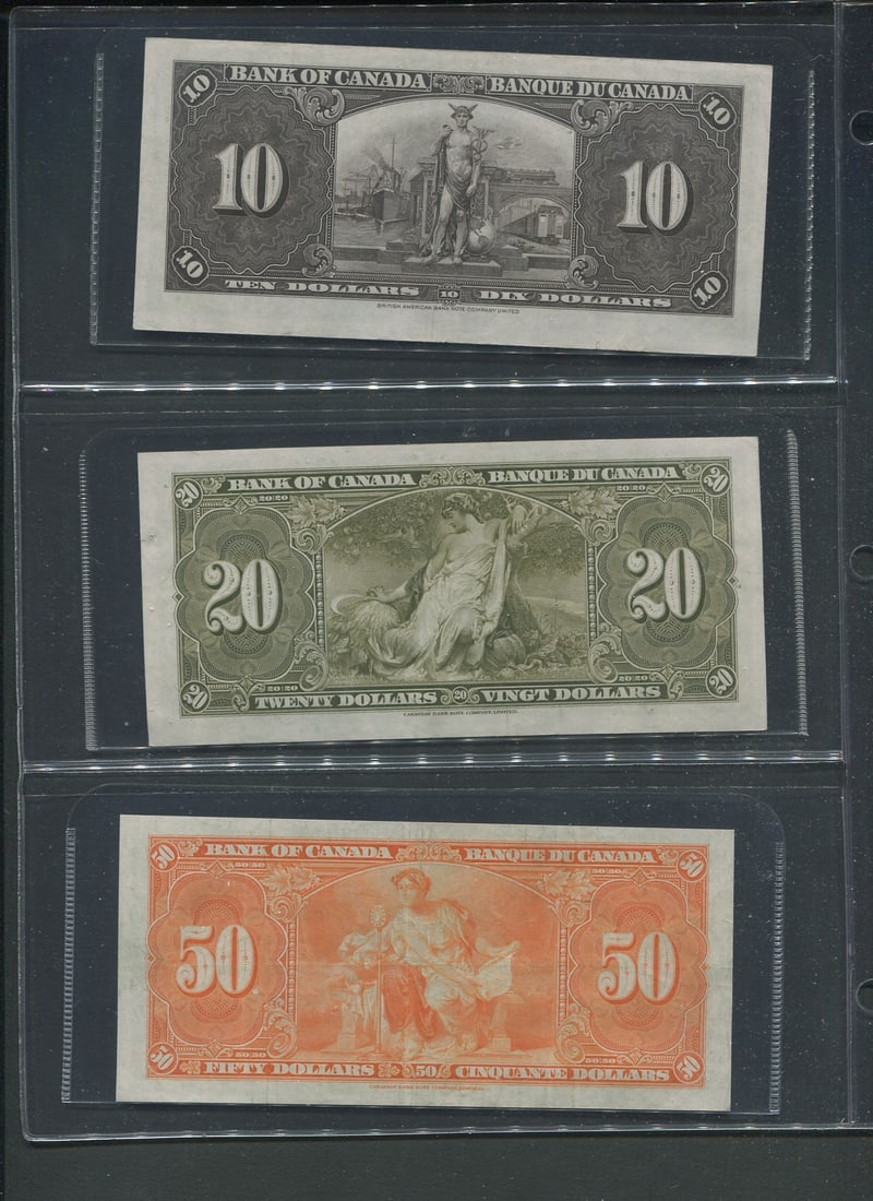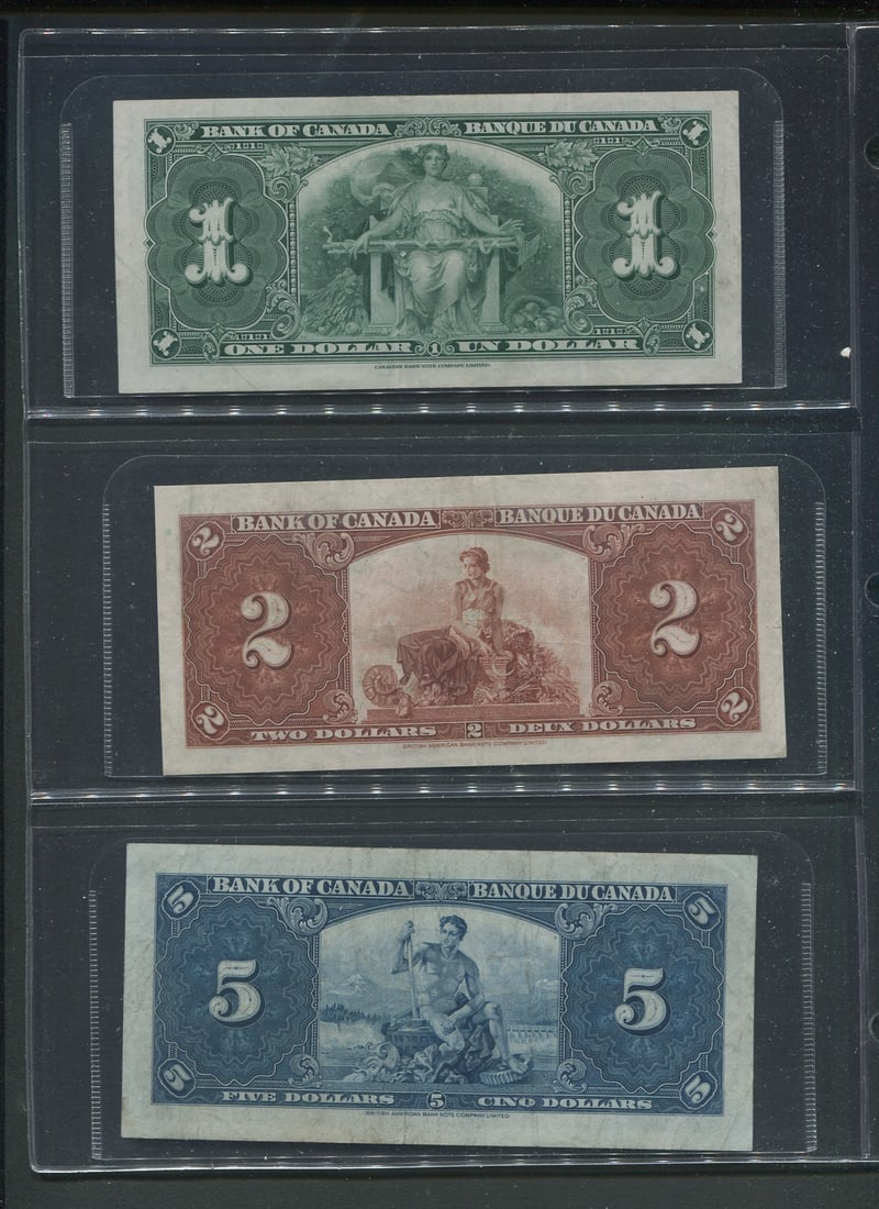 A broad range of Canadian Bank notes, including 40 Gem uncirculated 1967 confederate notes in the Gem 67/68 category, 1973 (4(9 more 1067 VF/XF, 1937 $2.00 VF/XF, 1986 (6), 1974 $2,00, 1937 $2.00 (grades from VF-AU),1986 $5.00 XF, 1937 $10.00 (5 notes grades from VF-EF), 1937 )9 notes, grades Fine to EF),1975 $50.00 VF, 1954 $50.00 ( 2 notes VF and XF), 1927 $100.00 VF),1935 CIBC Fine, Replica Confederate note, and a "fantasy 1,000,000 note. Face value alone is $500.00 USD (Image 1)