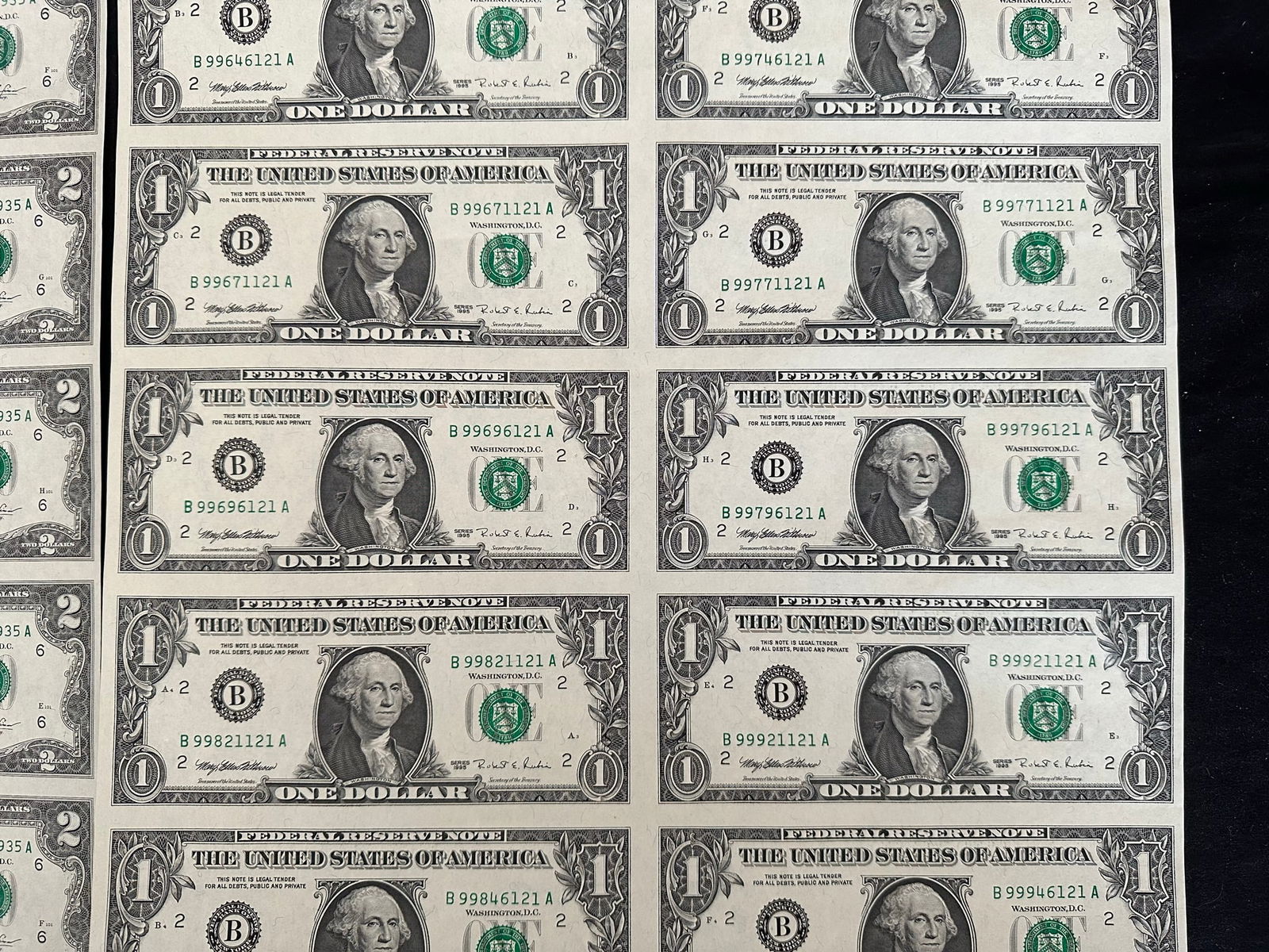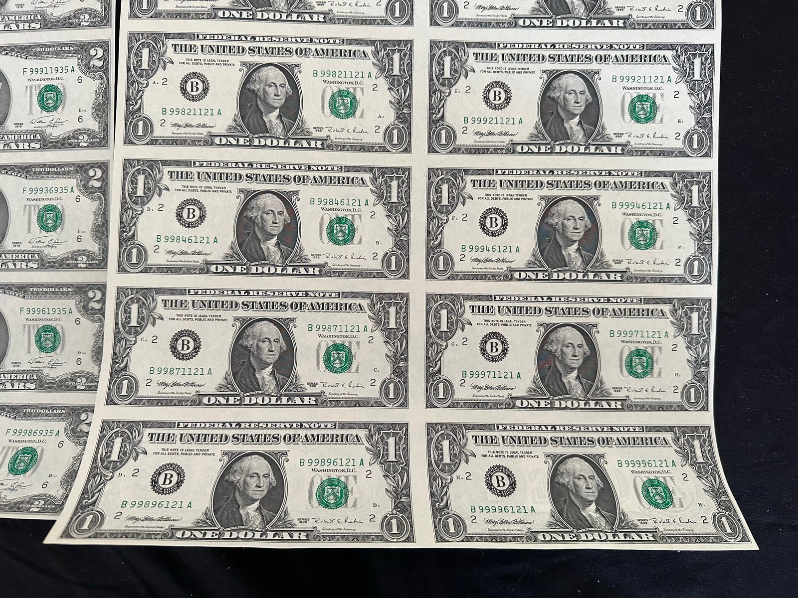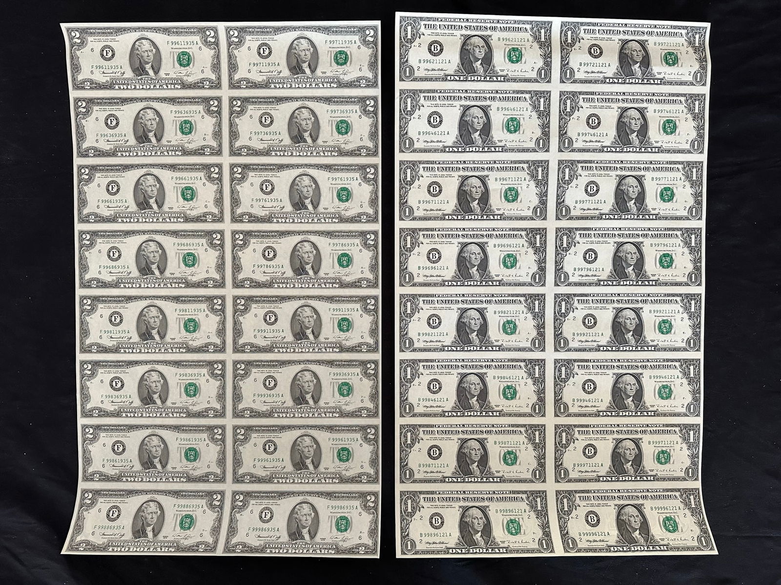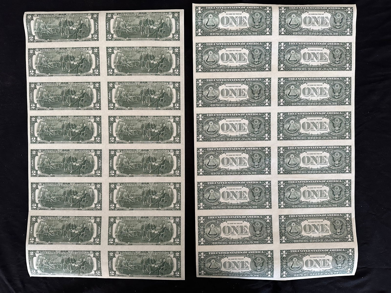 2 USA uncut sheets, of 16 of $2.00 and $1.00 bank notes, crisp condition, both in rolls and each having their own tube. (Image 1)
