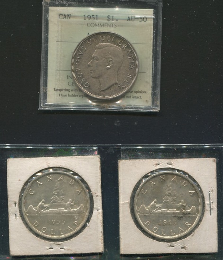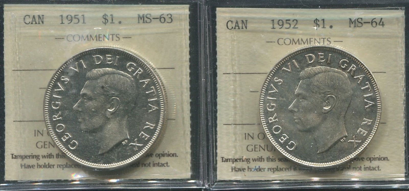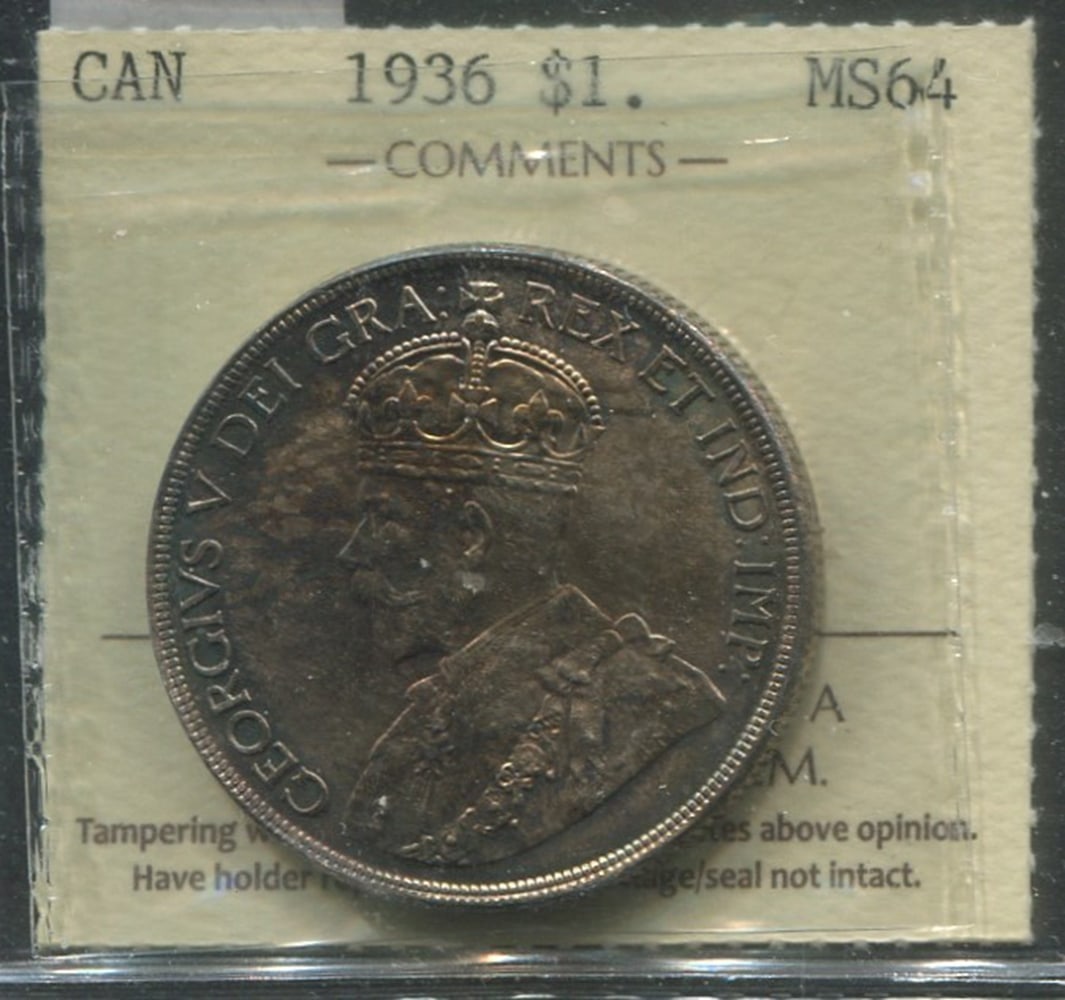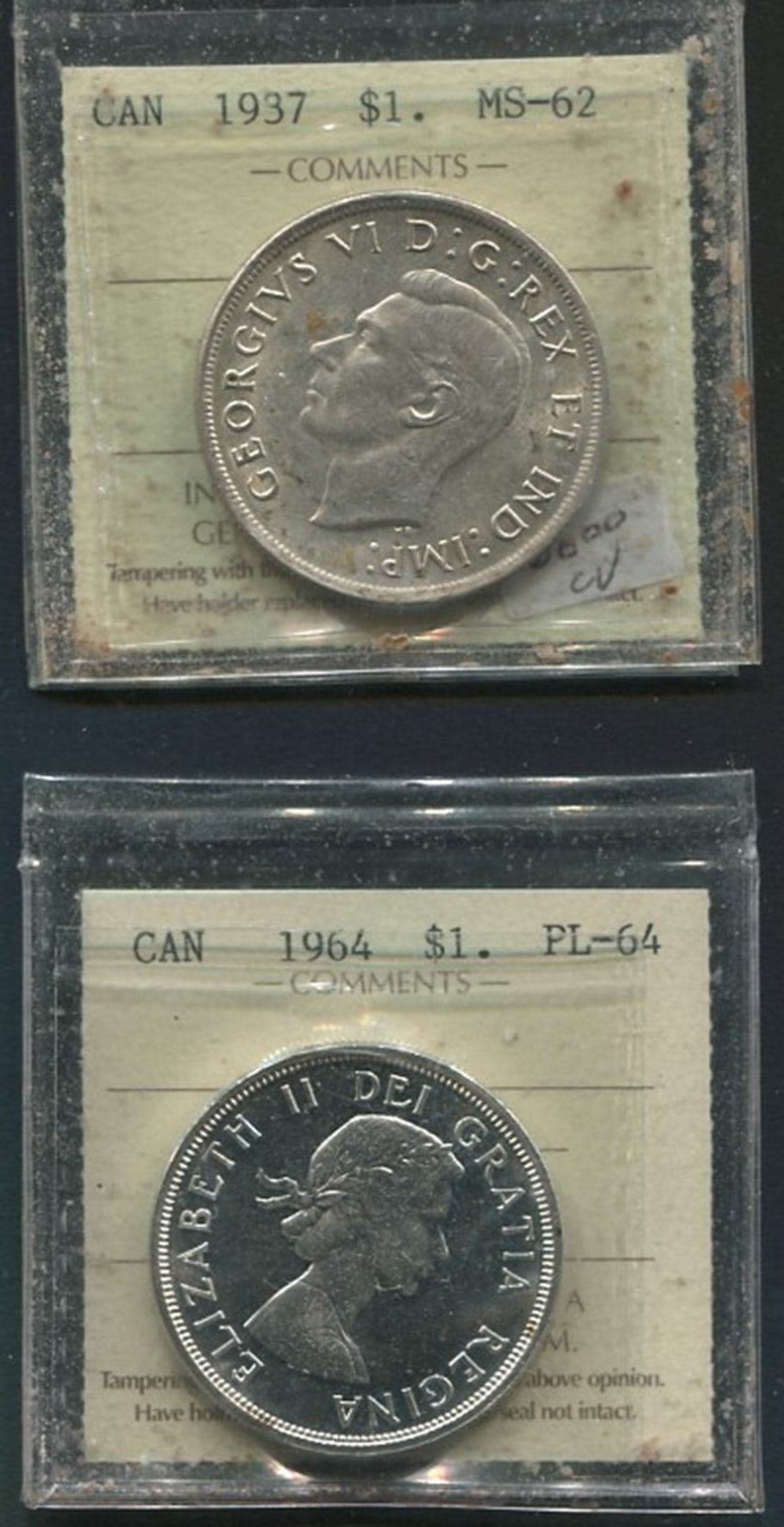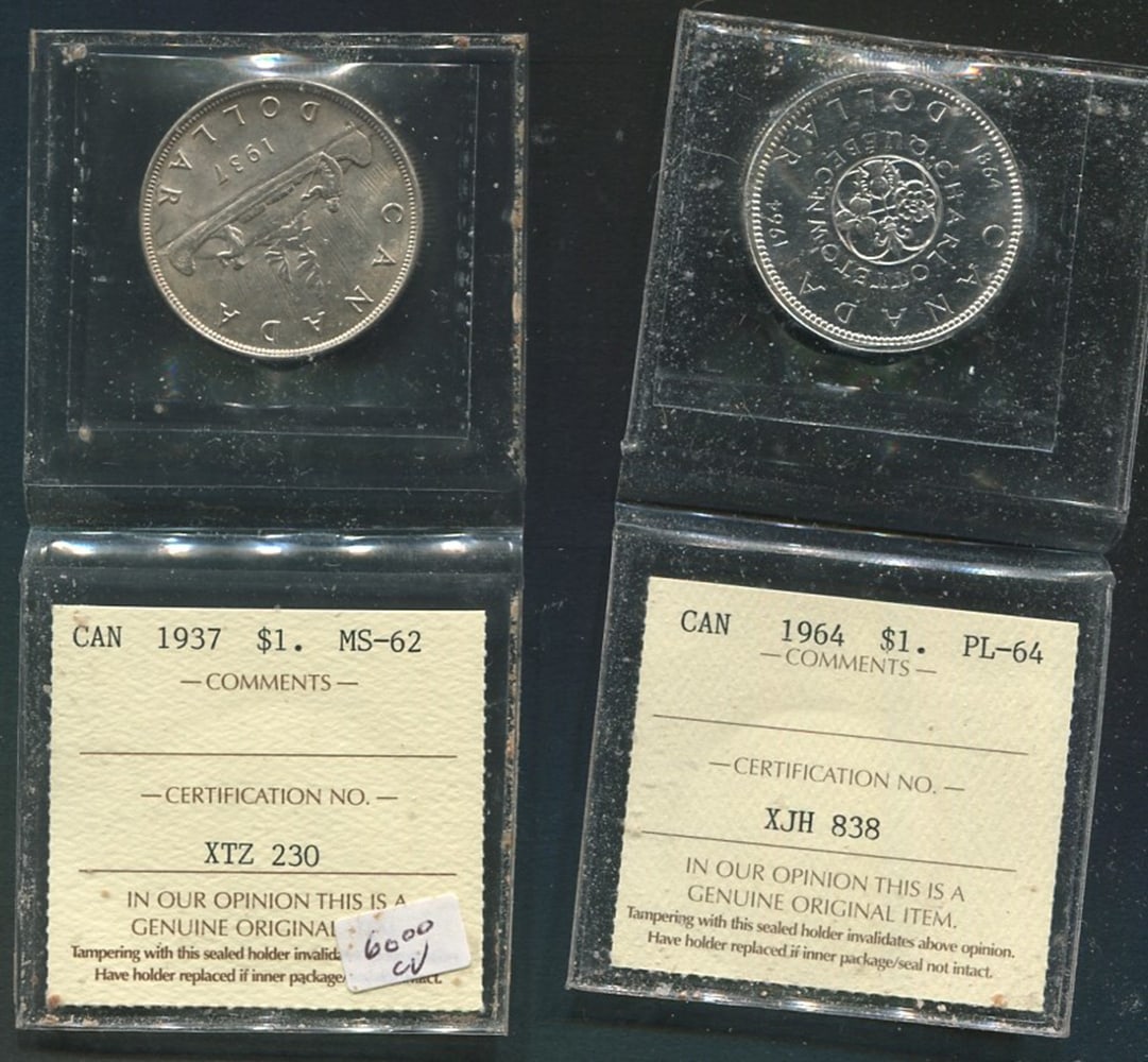 Two Canada Silver Dollars, 1937 ICCS MS 62 and 1964 ICCS PL 64. (Image 1)