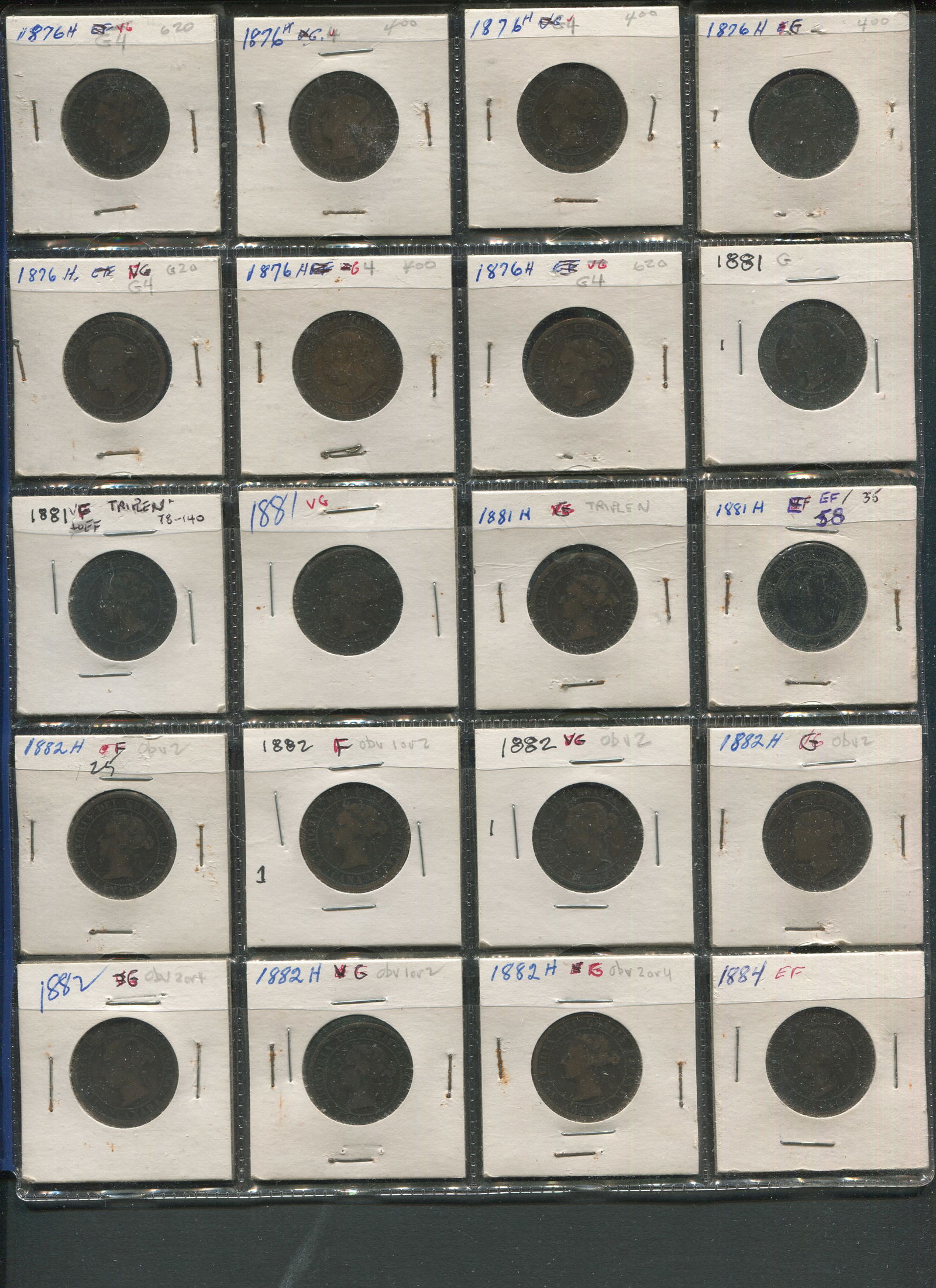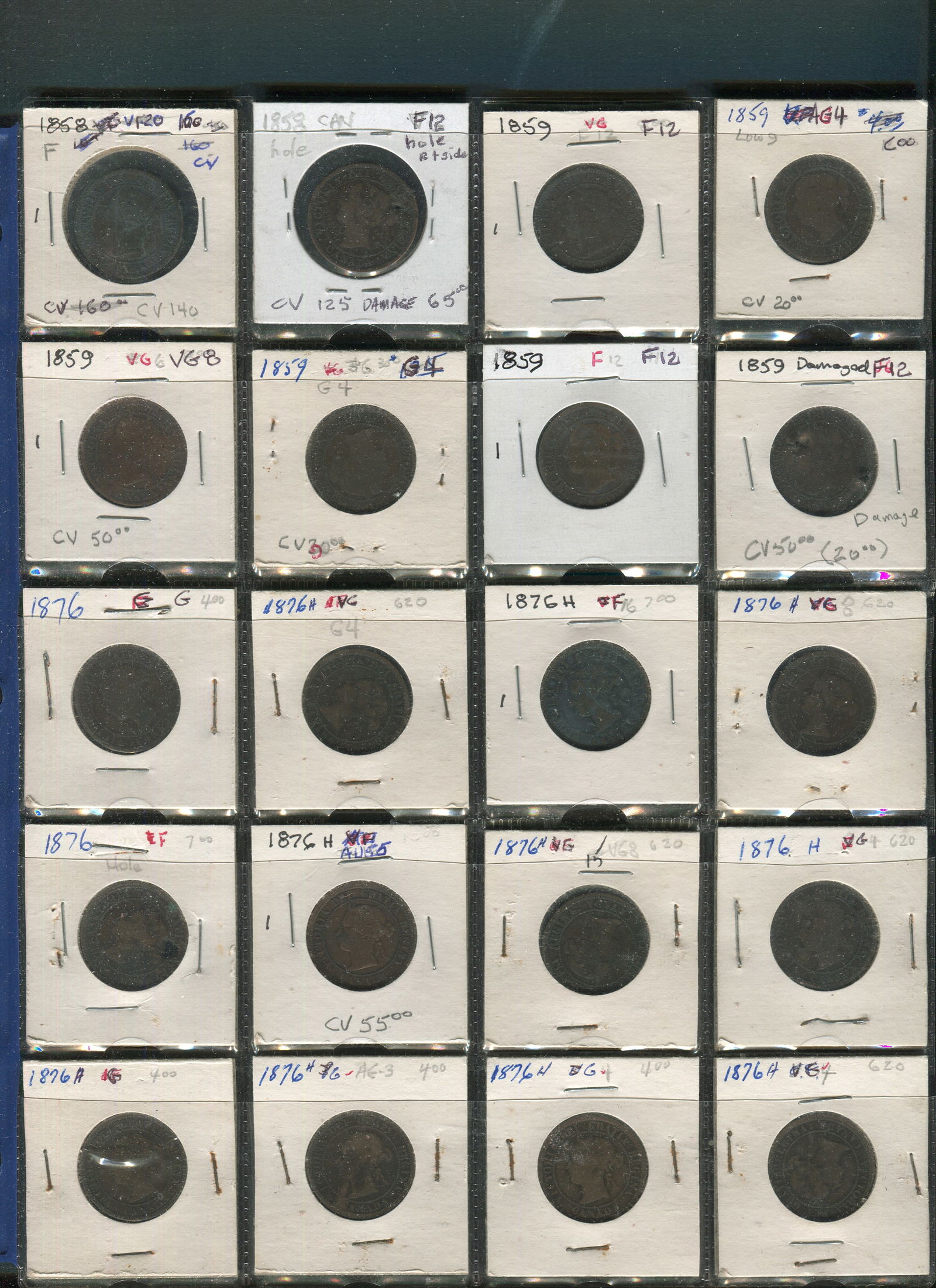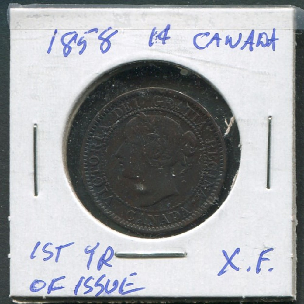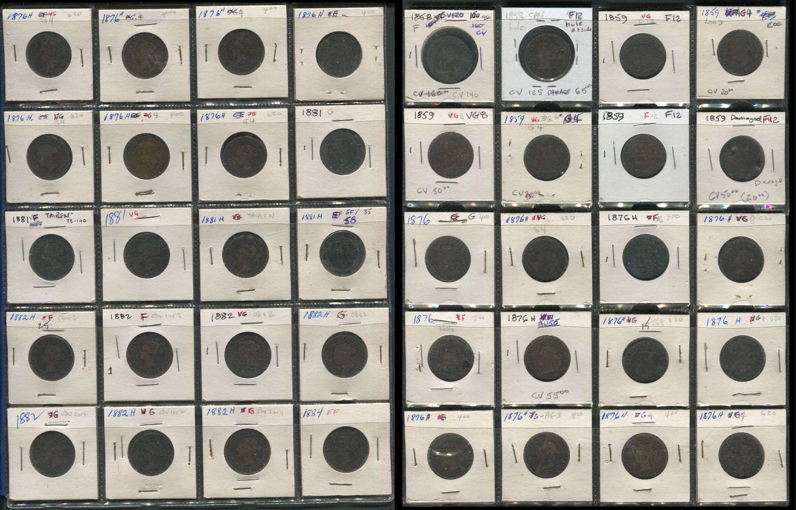 This lot is a 40 coin collection of Canada large 1 cents. Grades range from G to VF and includes 2 1858 first year of issue and several 1859, as well as several of the Heaton coin issues (Marked "H"). (Image 1)