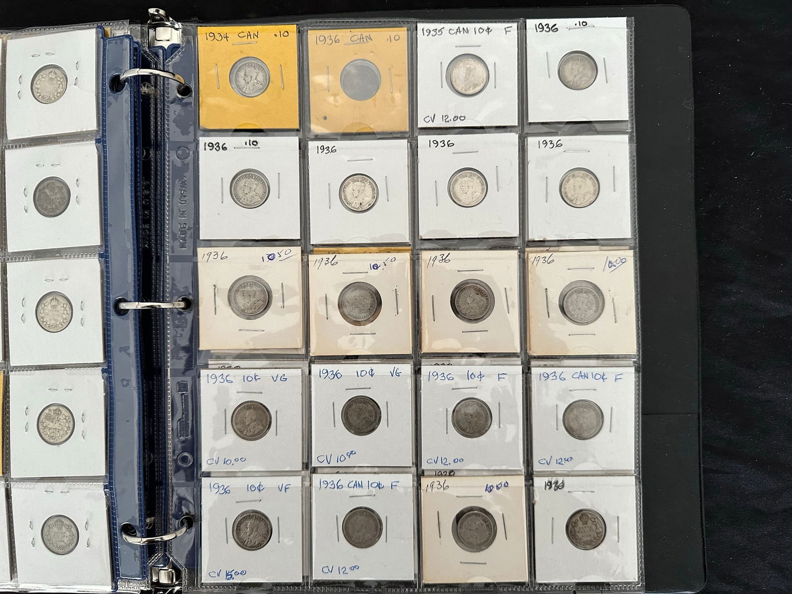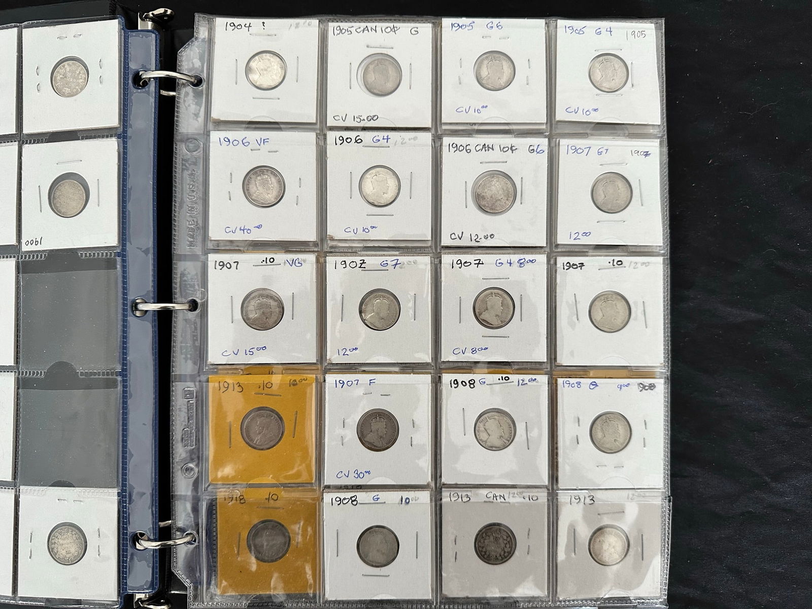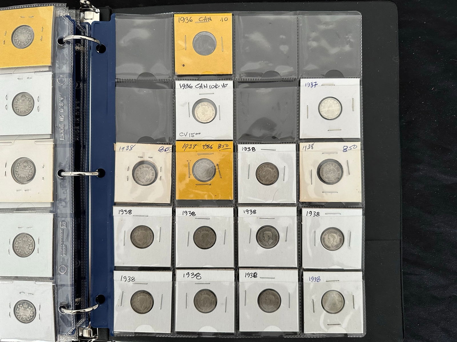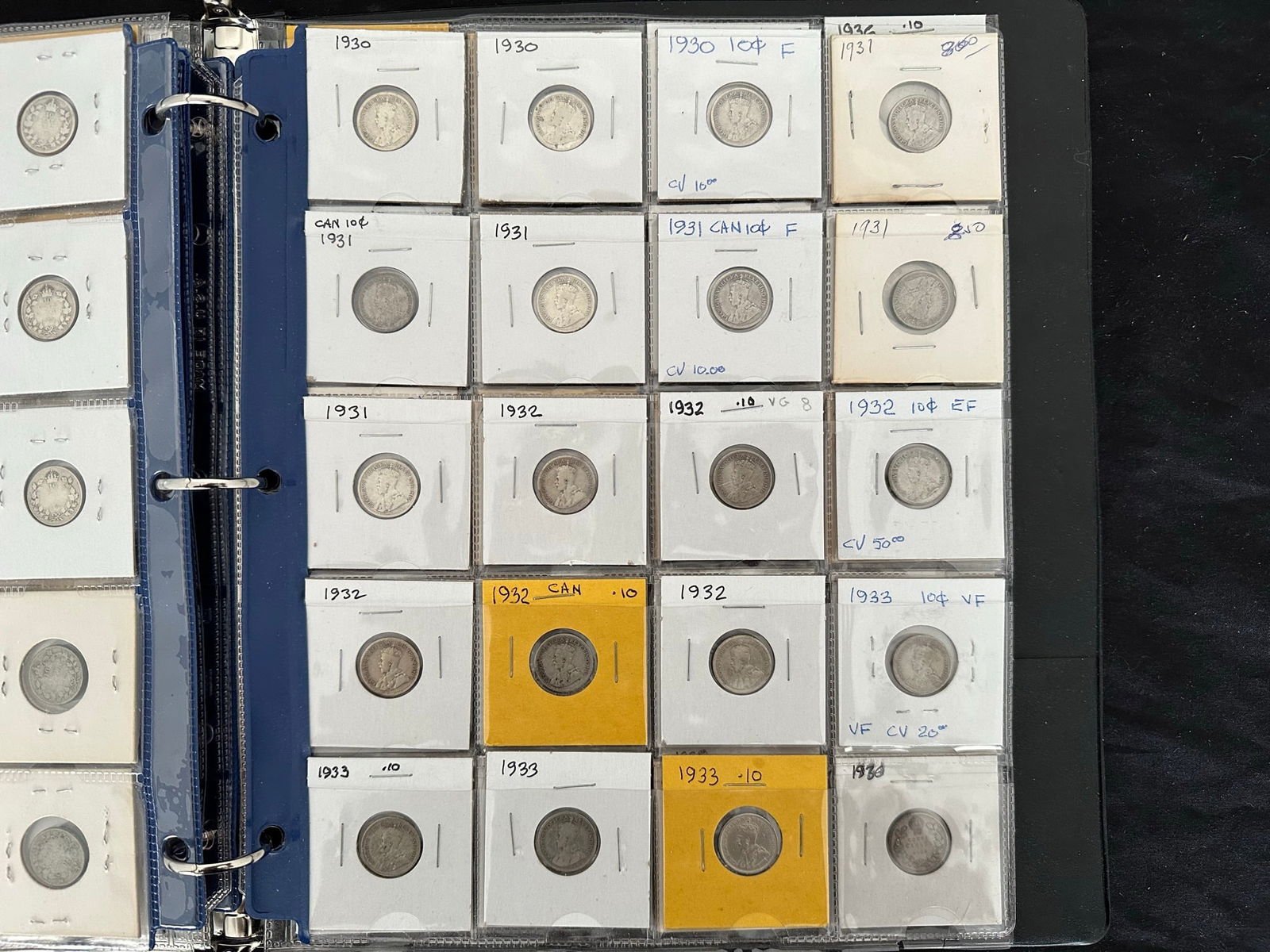 This lot is a collection of160 Canada silver 10 cent coins from 1888 to 1938,inc;uding 7 Victoria, 33 Edward VII, 108 George V, and 13 George VI. Some "semi-key" dates such as the 1915 10 cents and a nice EF 1932 10 cents. Overall grades are G, VG, F. All are silver coins. (Image 1)