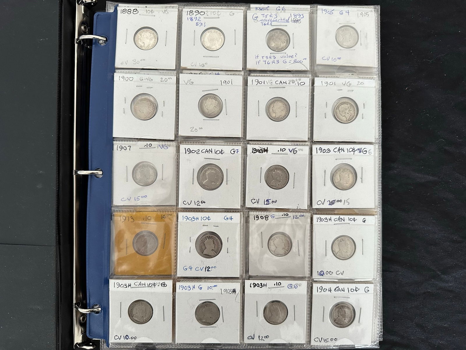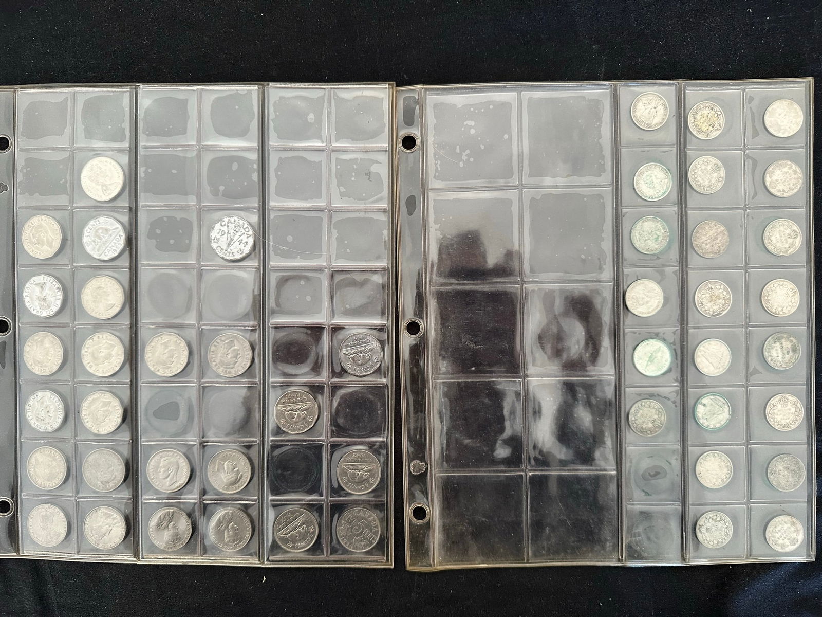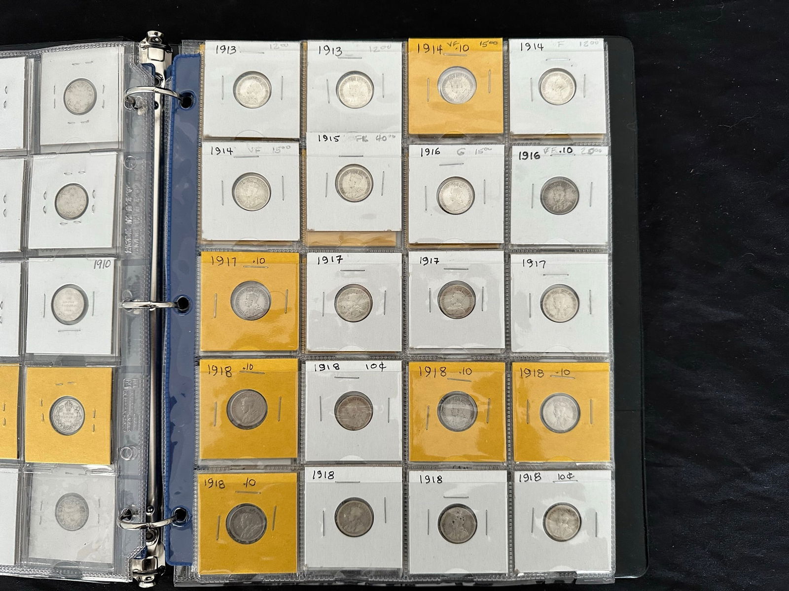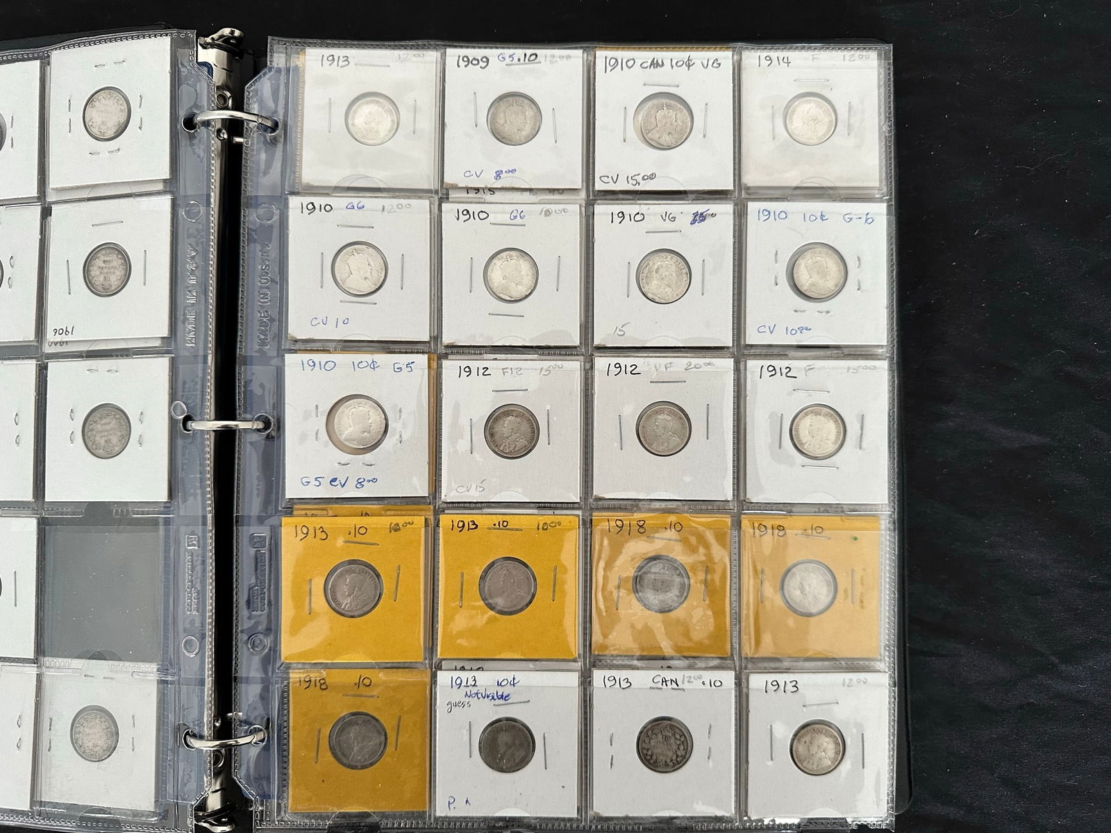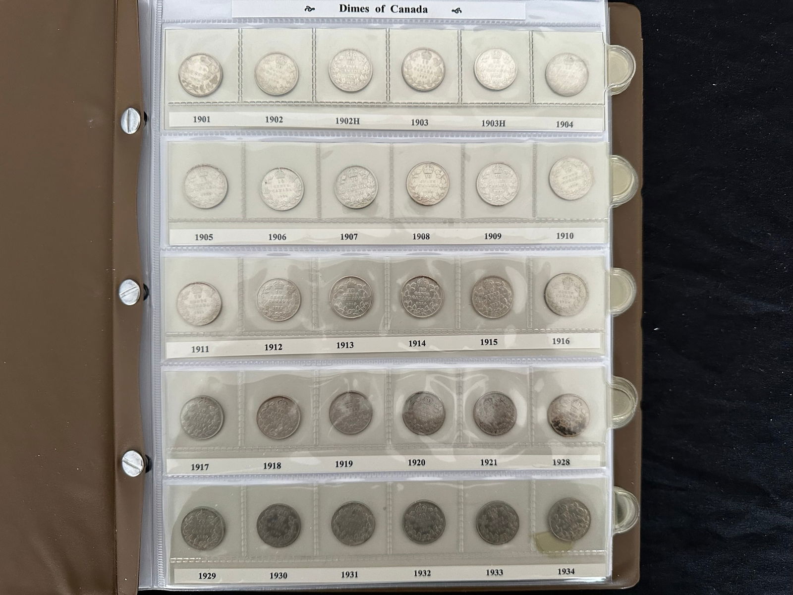 This lot is a collection of160 Canada silver 10 cent coins from 1888 to 1938,inc;uding 7 Victoria, 33 Edward VII, 108 George V, and 13 George VI. Some "semi-key" dates such as the 1915 10 cents and a nice EF 1932 10 cents. Overall grades are G, VG, F. All are silver coins. (Image 1)