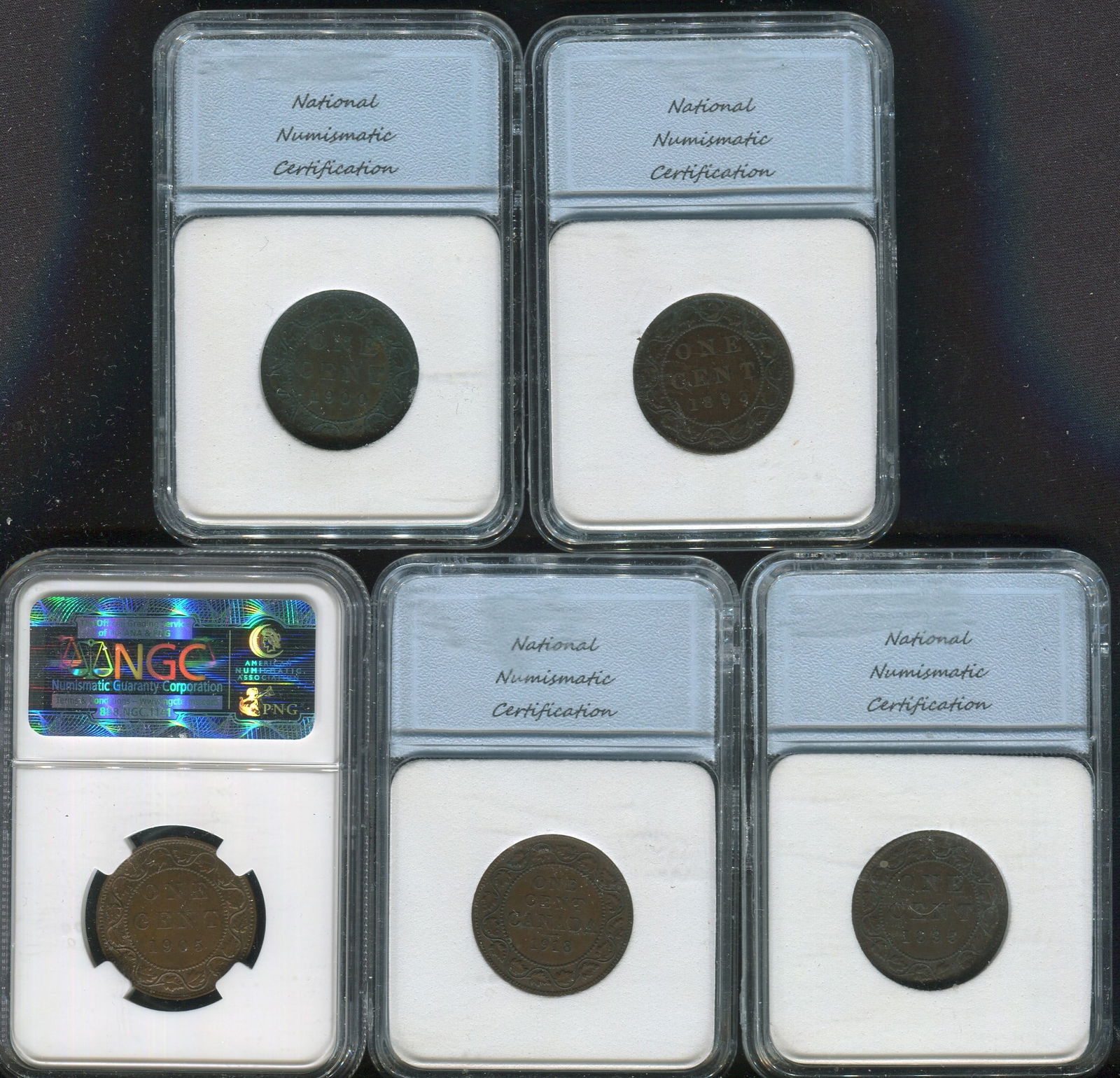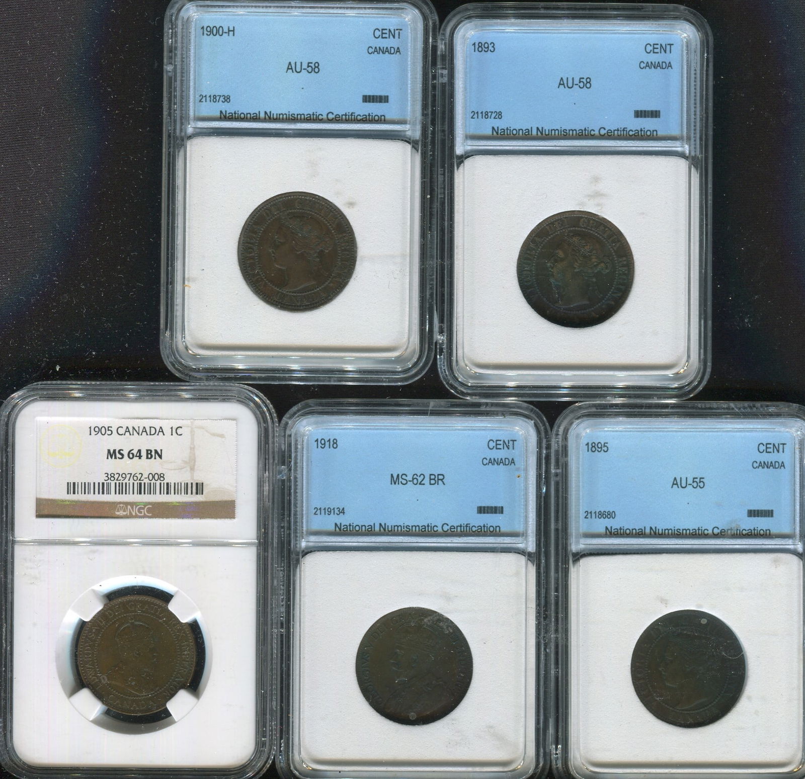 This lot consists of 5 Canada large cents including 1905 NGC MS 64BN, the other 4 coins all graded by NNC being 1893 (AU-58) ,1895 (AU55) 1900H (AU58), and 1918 ( MS-62 BR). Value per Coins and Canada of $210 CND, $210 USD. (Image 1)
