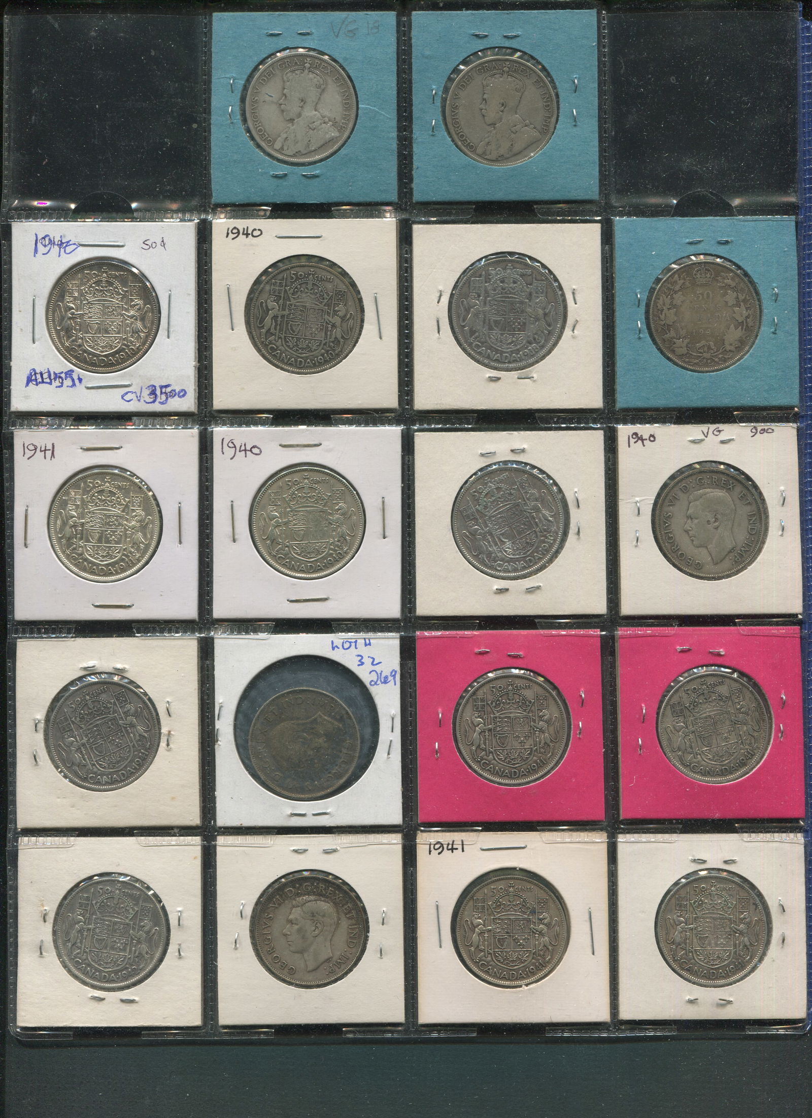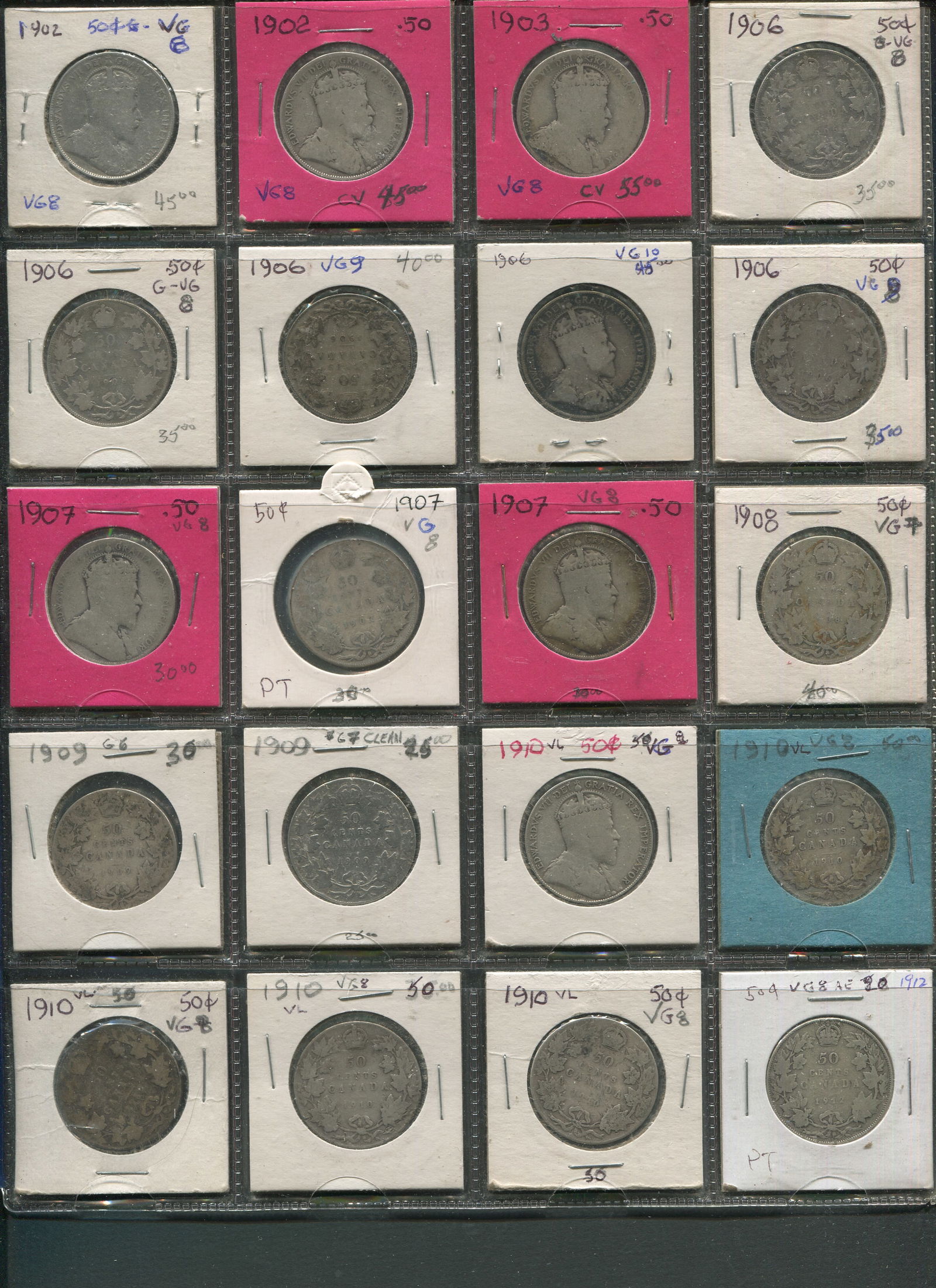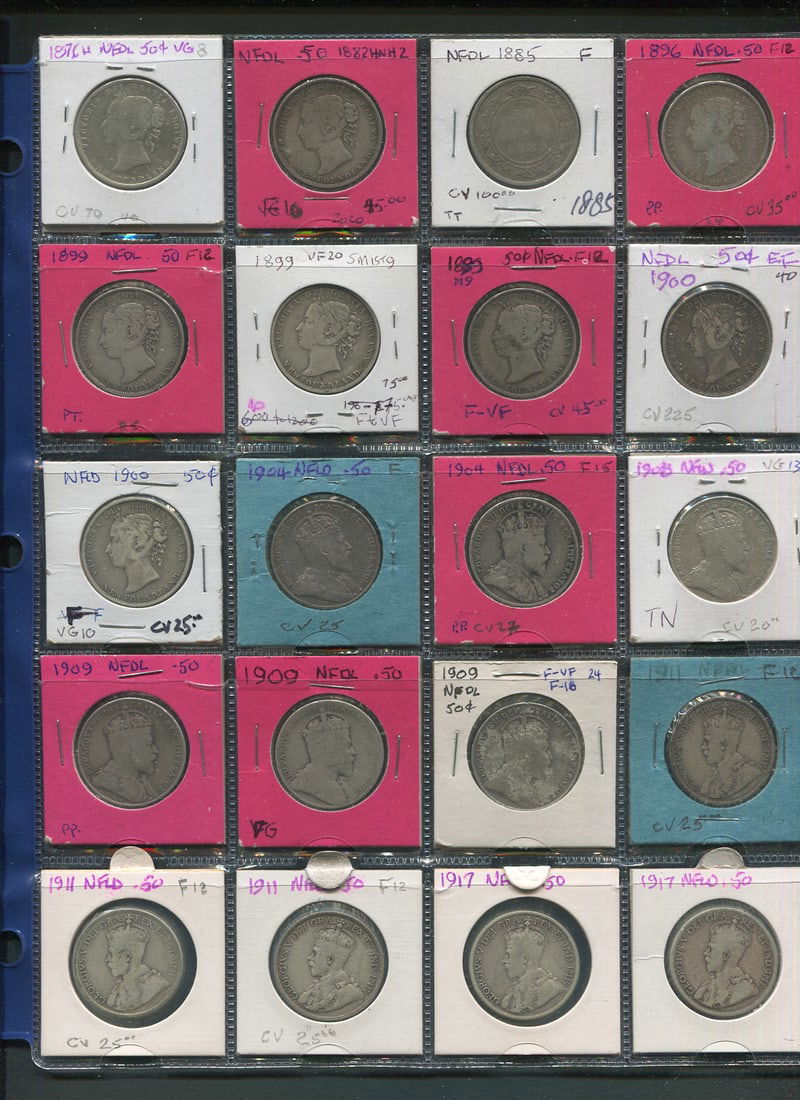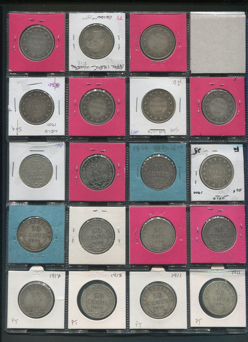 A Newfoundland 50 cents collection consisting of 20 coins, including 9 Victoria (1876H 1882, 1885, 1896, 1899 (3) 1900 (2), 6 Edward including 1904 (2), 1908, 1909 (3), 1911 (3), 1917 (2), 5 George I including 1911 (3), 1917 (2). Grades average VG-Fine. (Image 1)