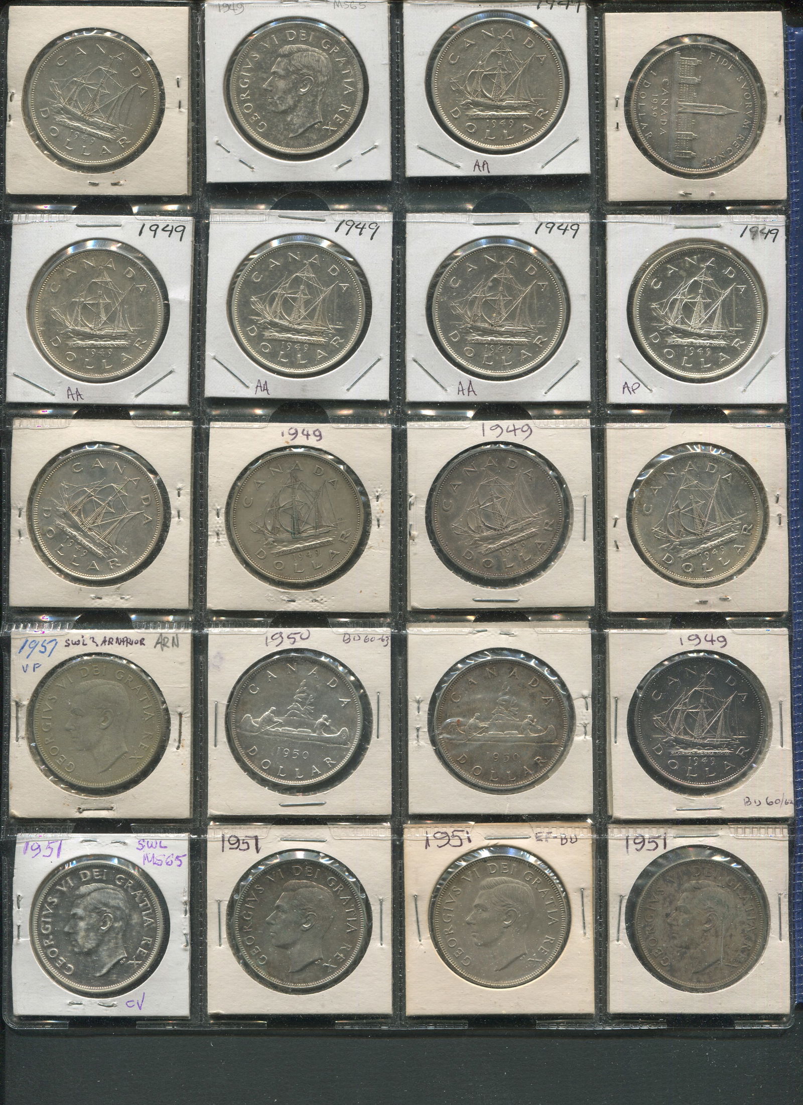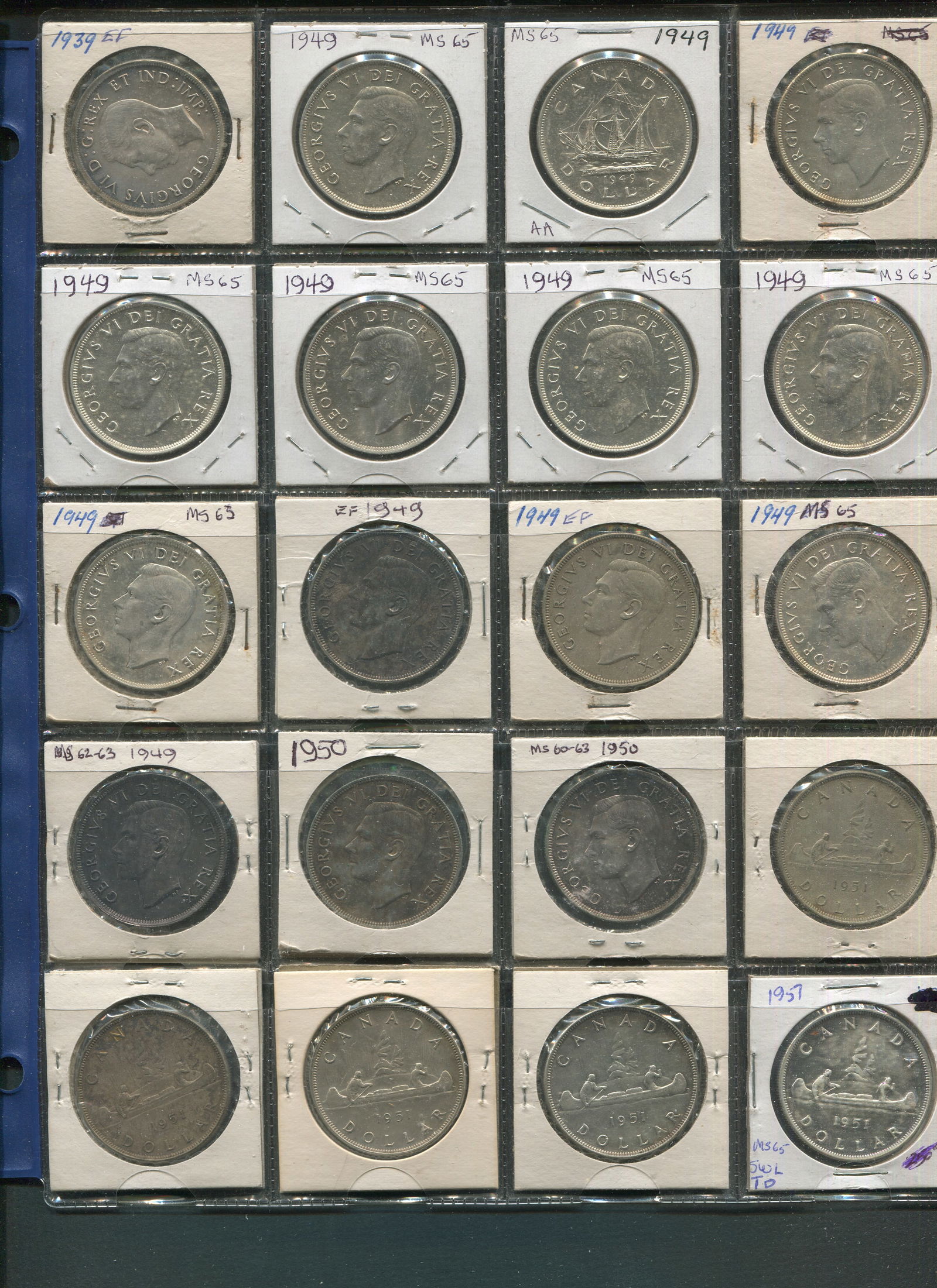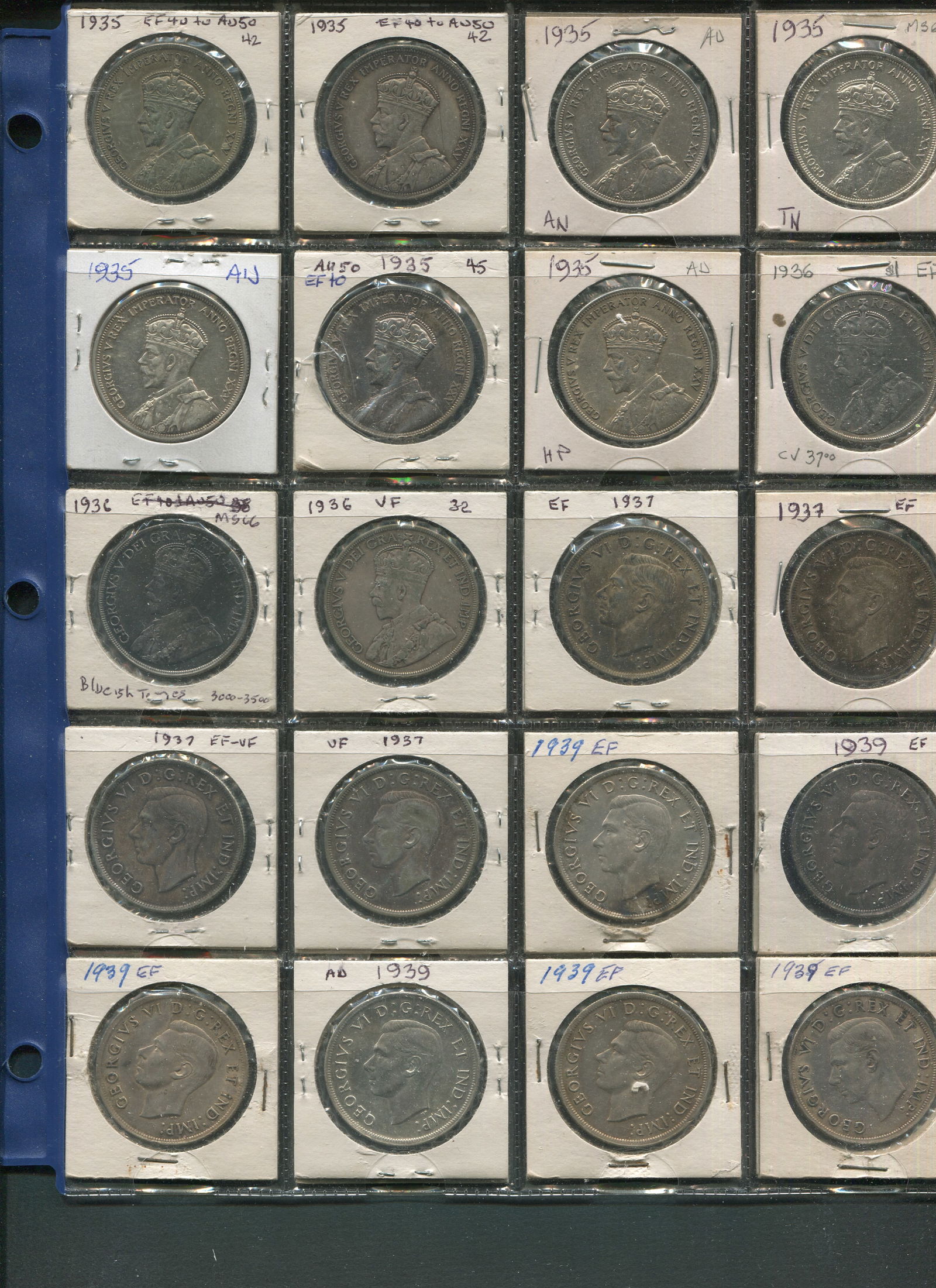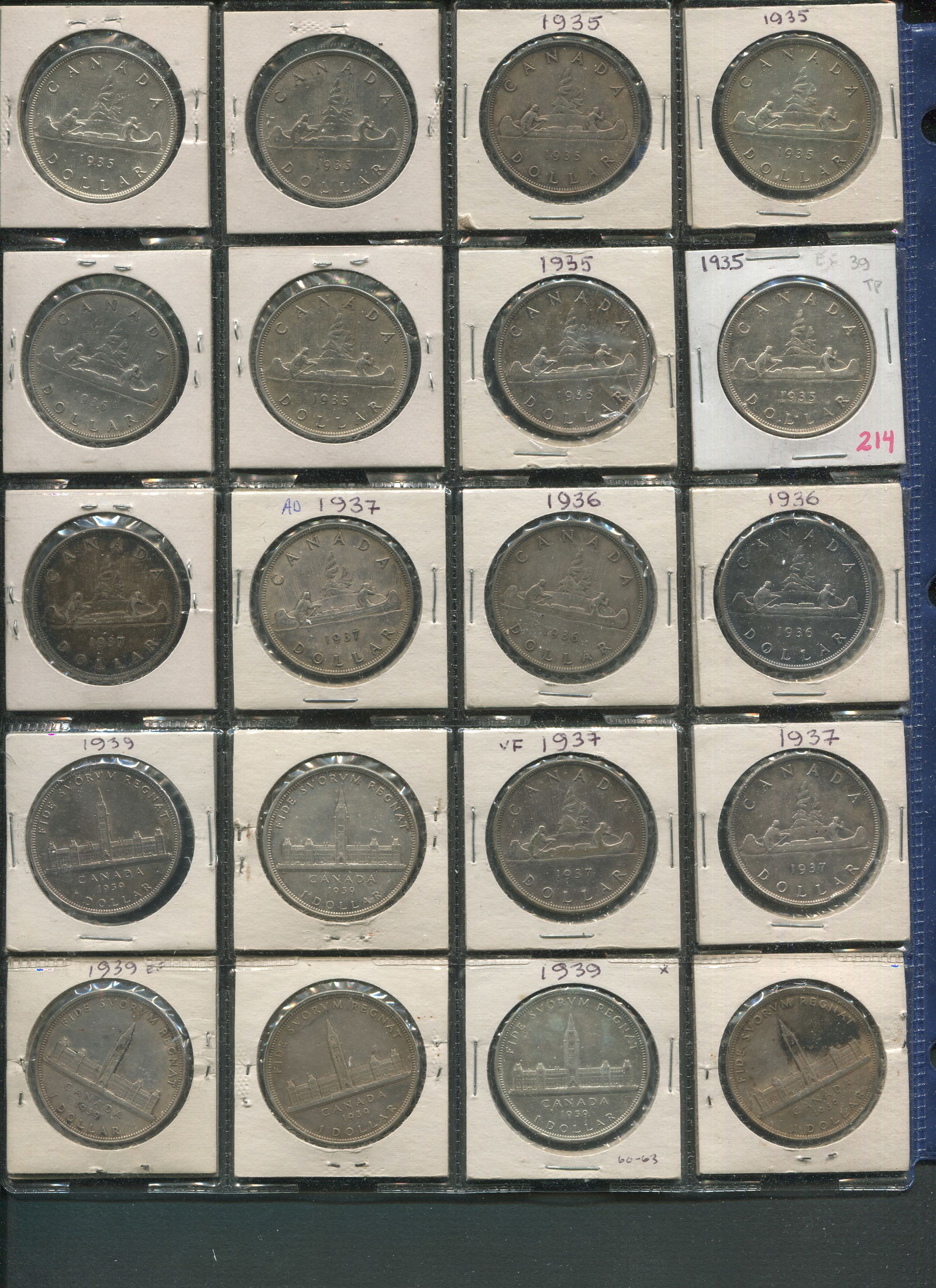 Canada Silver Dollars, 1935-1939 Collection. Consists of 20 siver dollars as follows: 1935 (7), 1936 (3), 1937 (4), 1939 (6). 20 silver dollars in total, grades ranging from VF-AU. (Image 1)