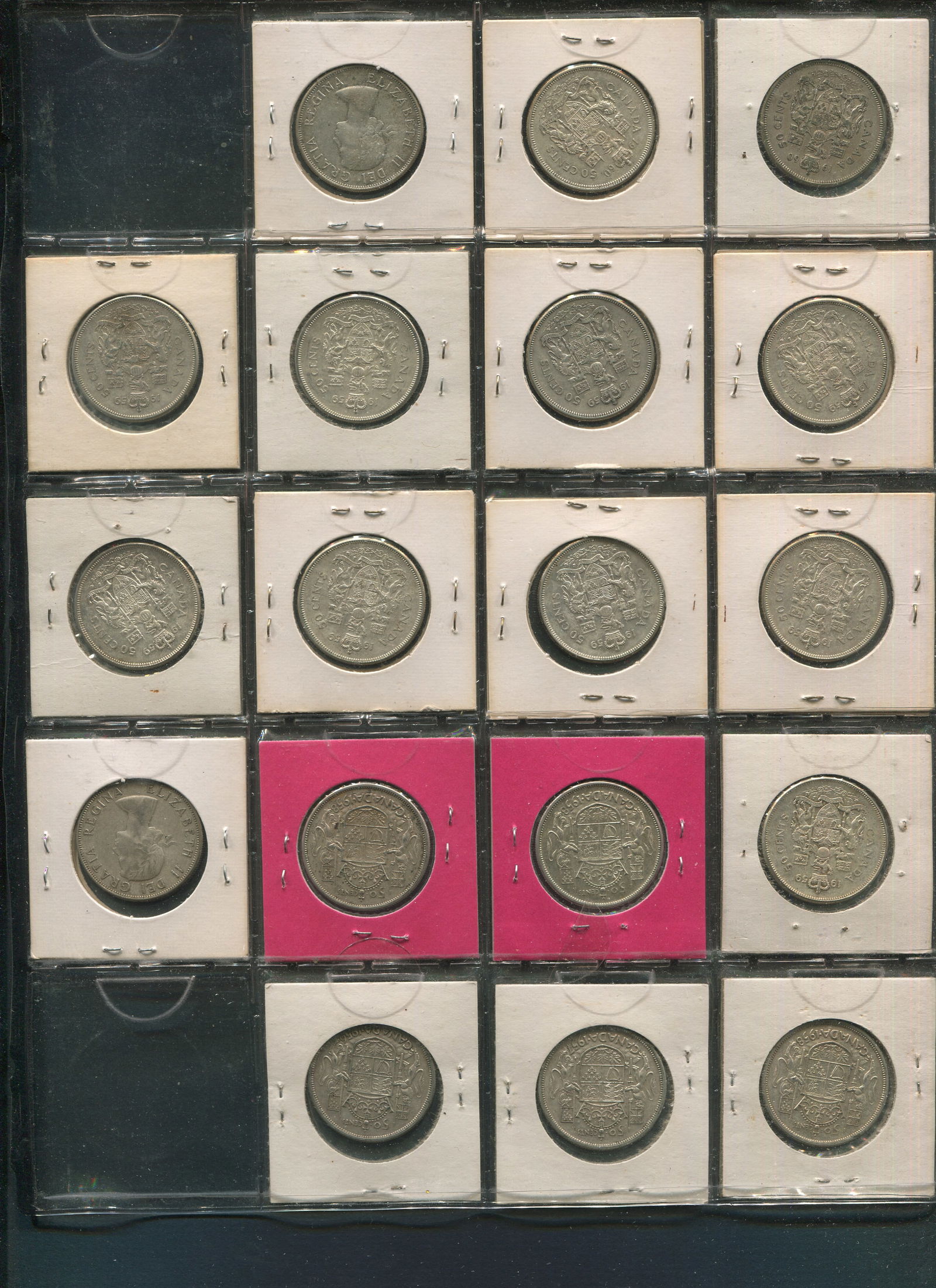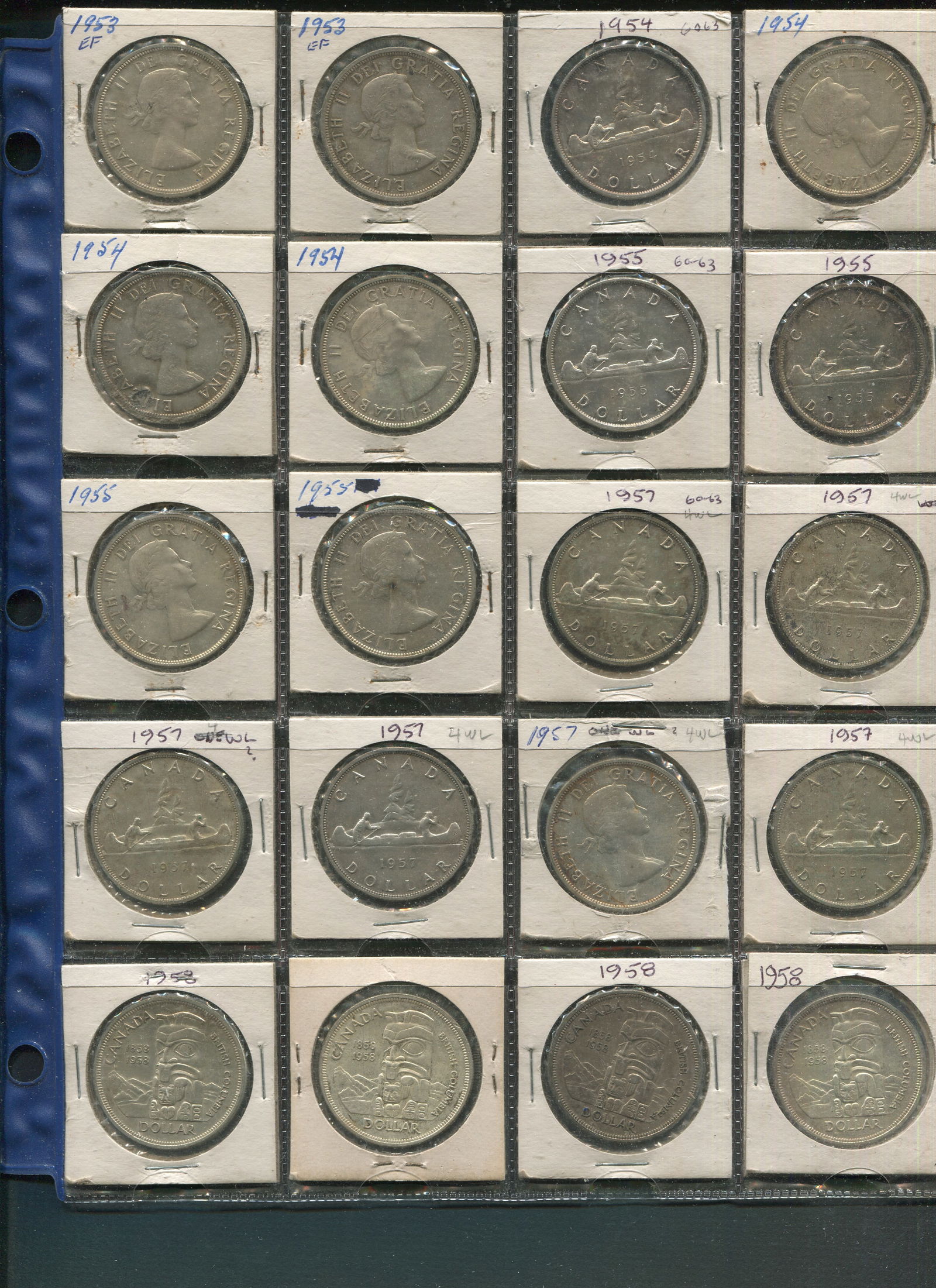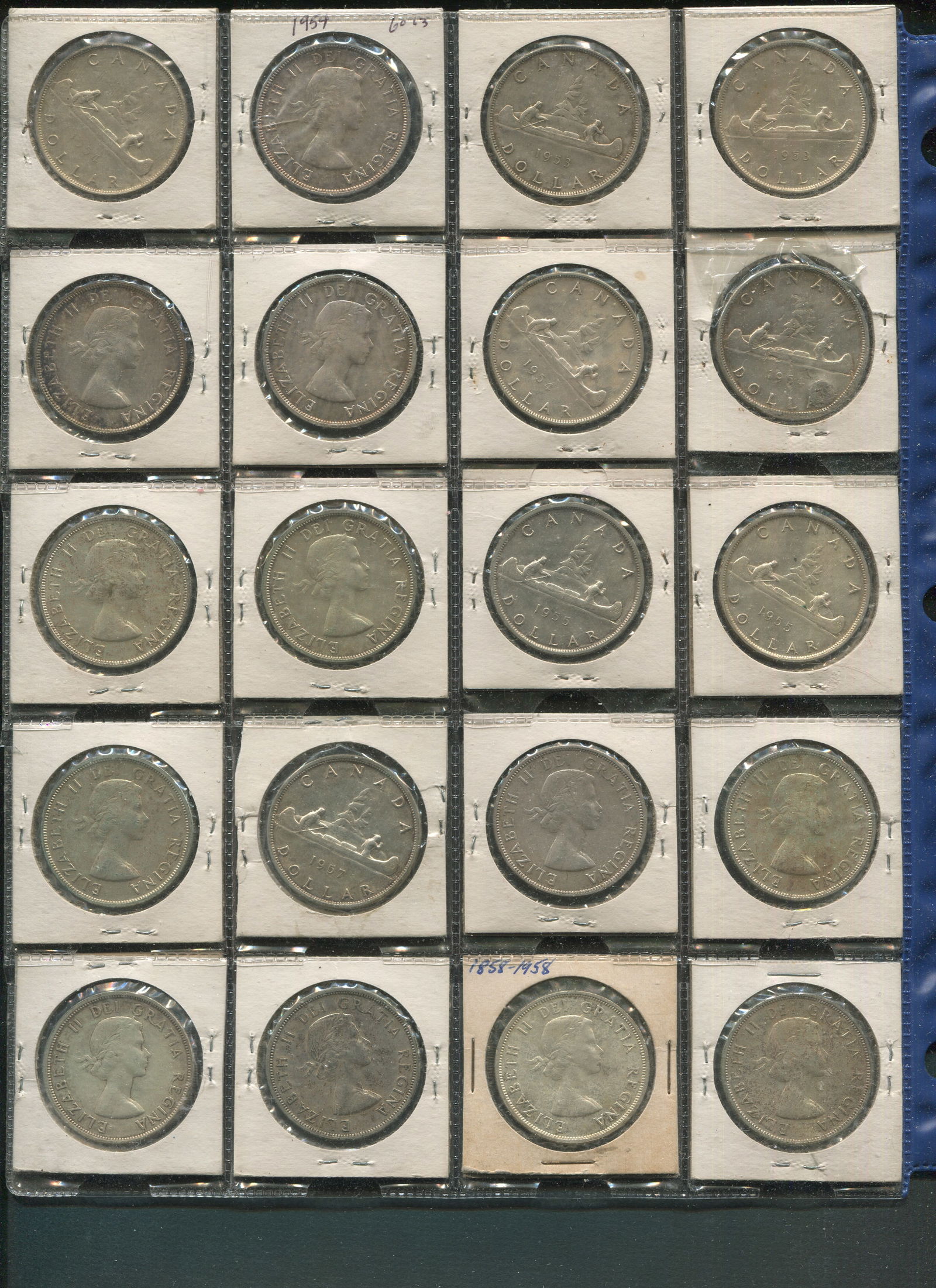Canada 1953-1958 Silver Dollars collection. 20 Canada silver dollars consisting of 1953 (2), 1954 (4), 1955 (4), 1957 (6), 1958 (4). Grades range from EF-MS. (Image 1)