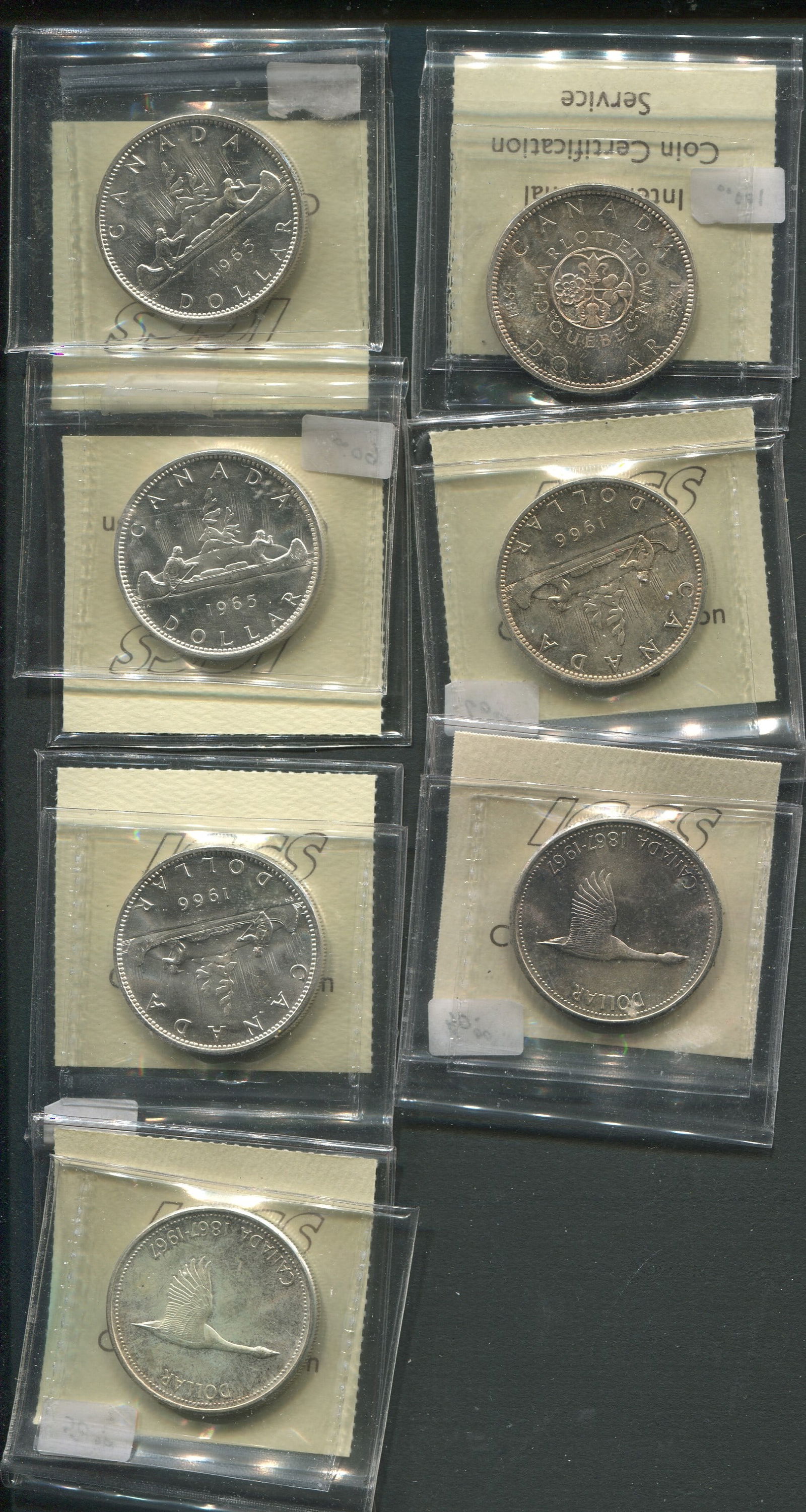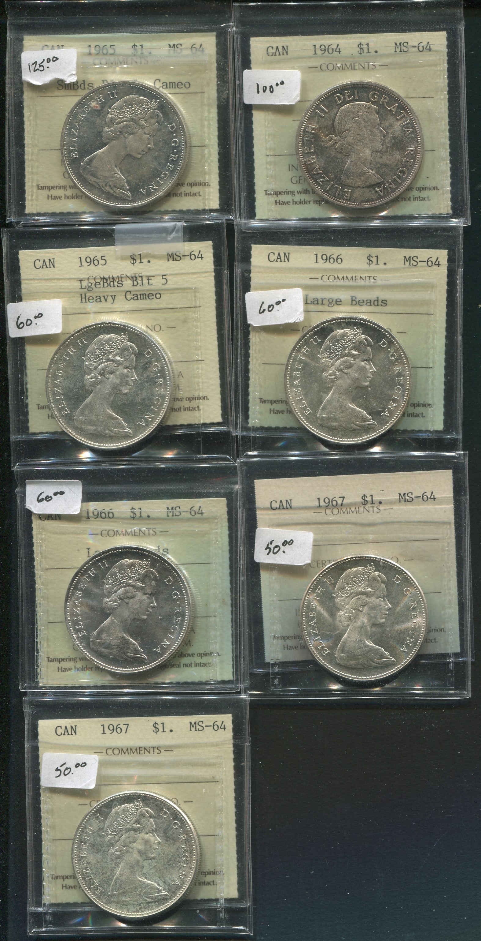 Canada 1964-1967 Silver Dollar Collection. 7 Canada silver dollars, all graded ICCS MS64. Includes 1964, 1965 small beads blunt 5, 1965 large beads blunt 5 heavy cameo, 1966 (2) large beads, 1967 (2). Trends $500. (Image 1)