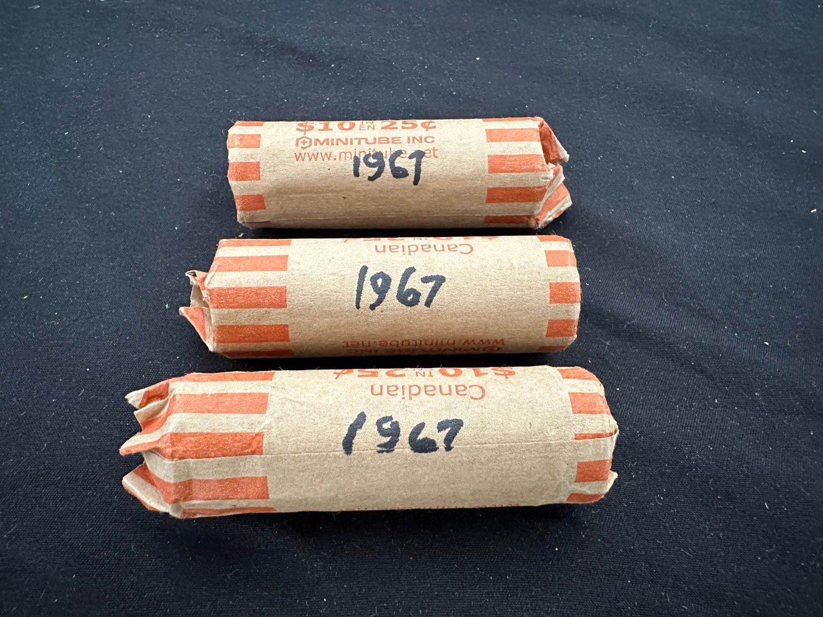 This lot consists of 3 Canada 1967 silver 25 cent rolls, each roll containing 40 coins . 120 coins in total. (Image 1)