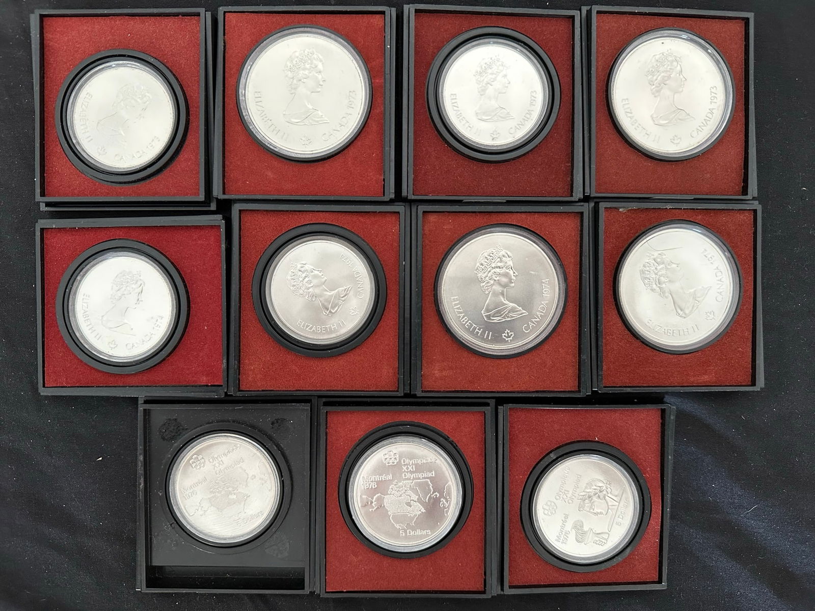 This lot consists of 11 Canada Montreal Olympics sterling silver BU Olympics coins, including 11 $5 and 4 $10 coins. All 11 coins are 92.5% purity. The $5 coins each weigh 24.3 grams and the $10 coins weigh 48 grams each, All coins are protected in plastic capsaules. (Image 1)