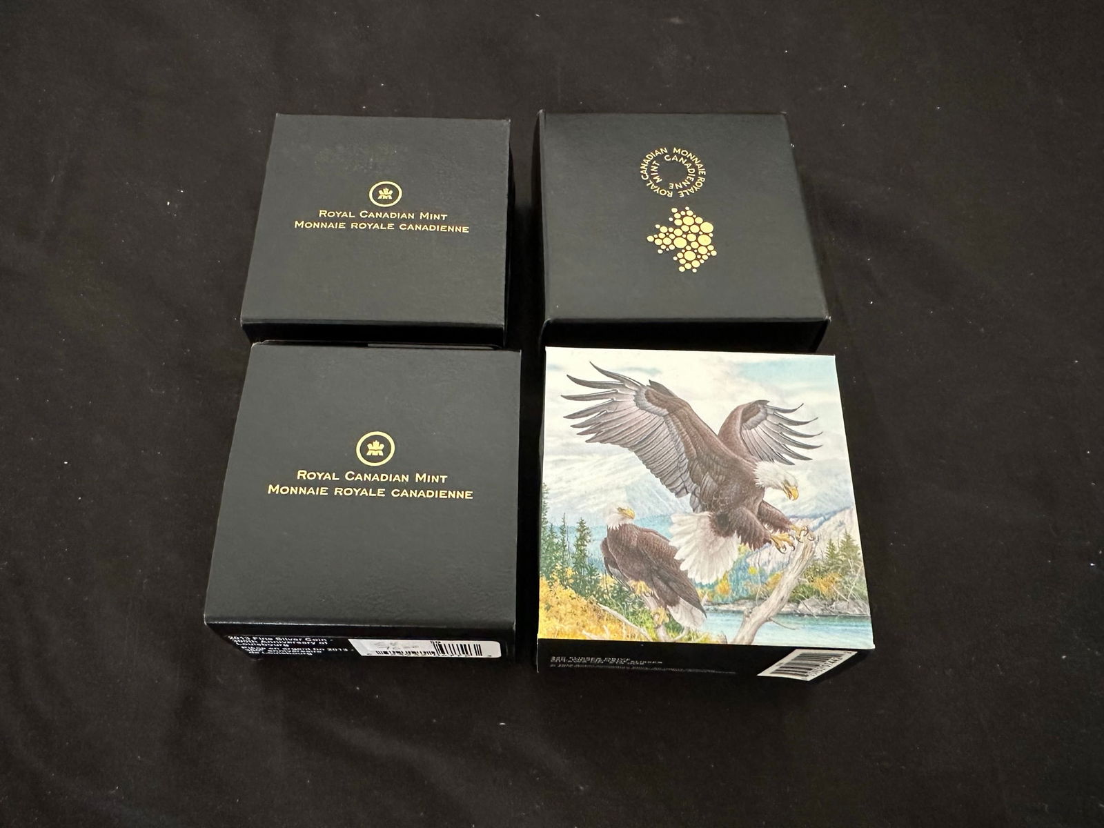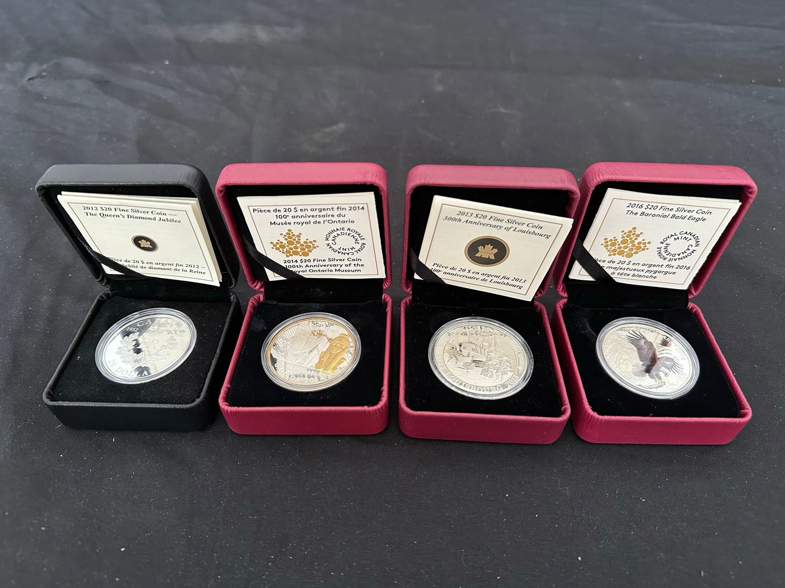 This lot consists of 4 $20 proof fine silver coins, all 99.99% pure silver. The 2012 proof commemorates the 60th anniversary of Queen Elizabeth. The 2013 proof coin commemorates the 300th Anniversary of Louisbourg. The 2014 proof coin celebrates the 100th anniversary of the Royal Ontario Museum, This spectacular coin has a gold plated image of the statue of Cleopatra VII. The superb 2016 proof coin features 2 bald eagles, one coloured and the other engraved. All 34coins are limited editions with certificates. (Image 1)