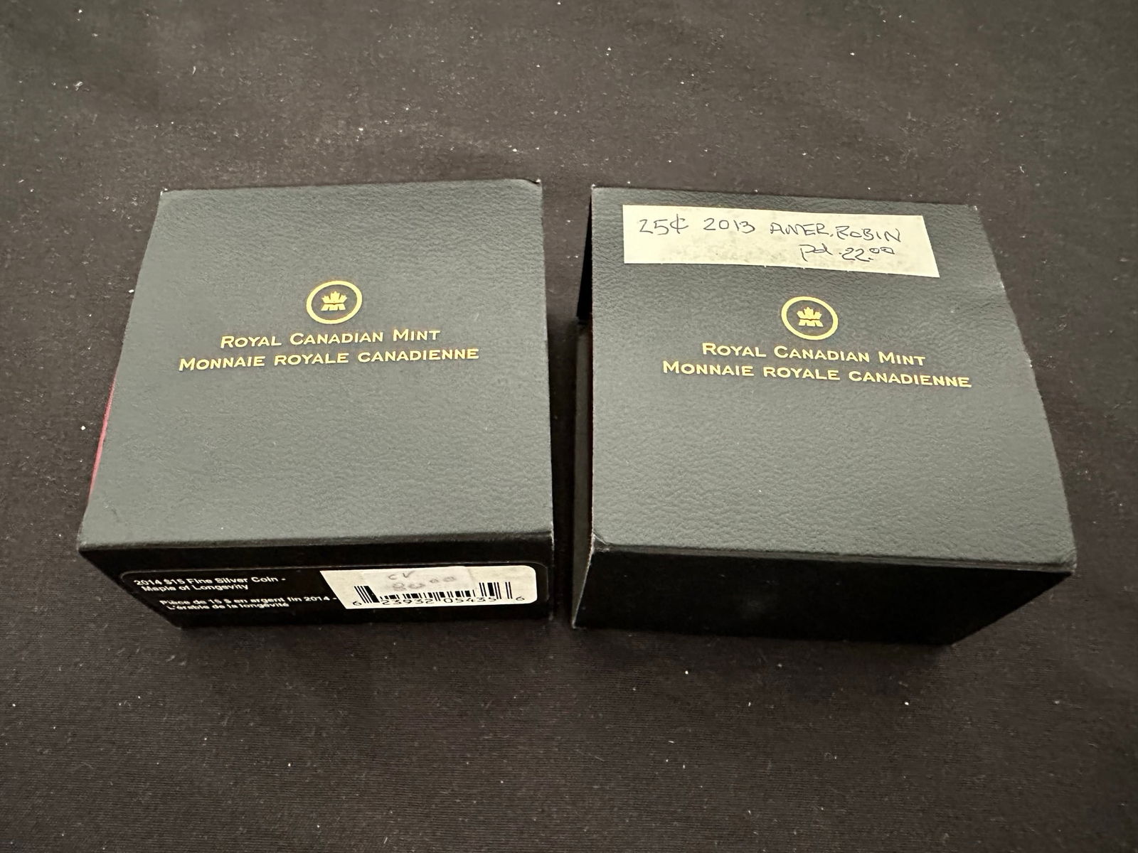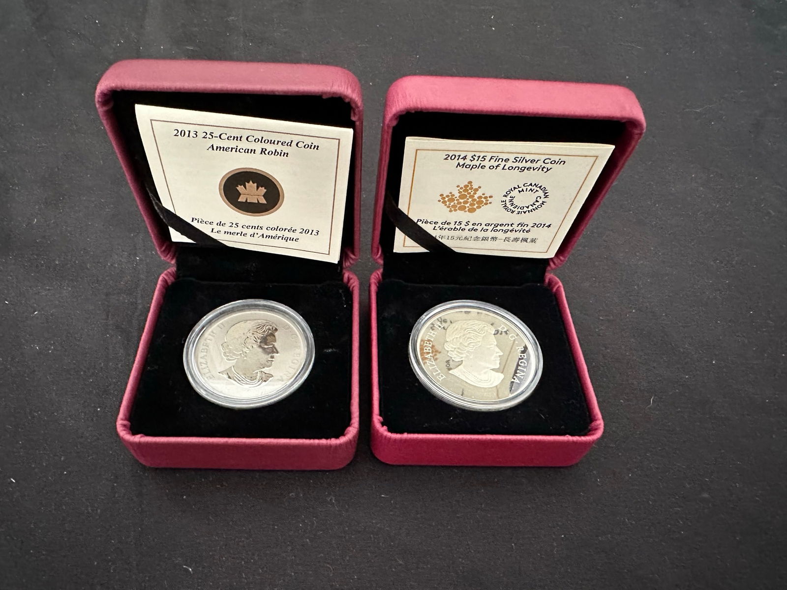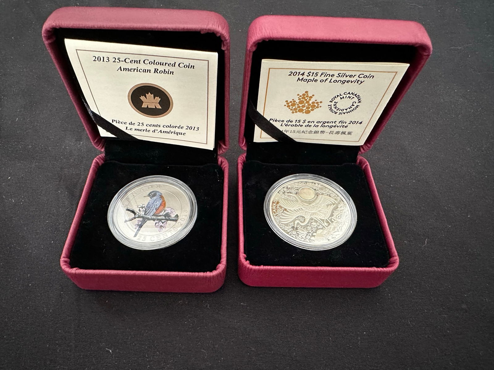 This lot consists of 2 Royal Canadian Mint fine silver coins being, a 25 cents coloured American Robin perched on a branch, and the 2014 $15 "Maple of Longevity# 99.99% pure silver with a metal weight of 31.39 grams.. Both coins have certificates. (Image 1)