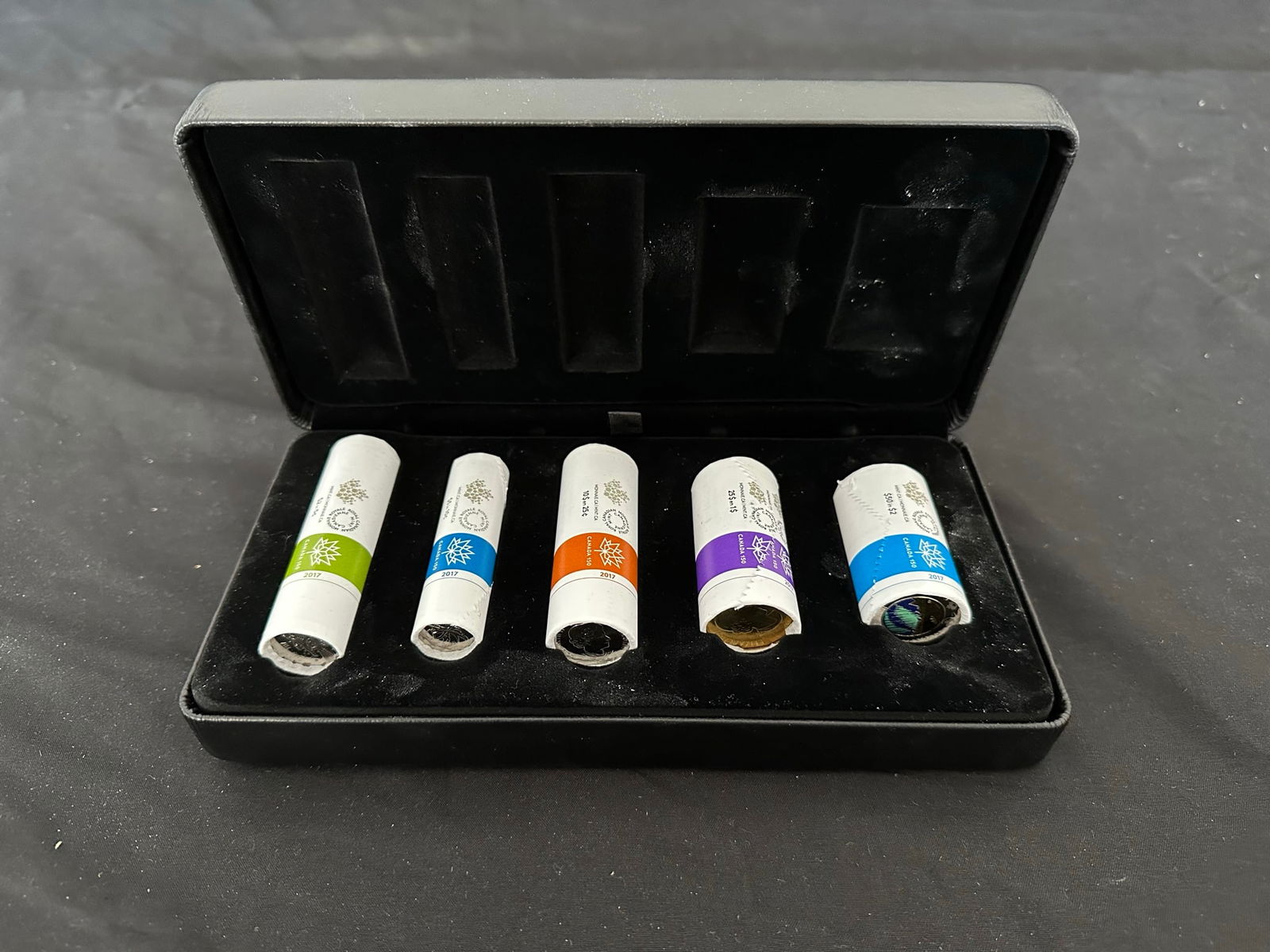 This lot is a special limited edition collection of 2017 "My Canada", My Inspiration special wrap roll collection. Only 10,000 sets produced.Roll denominations include a $2, $1, 25 cents, 10 cents, and 5 cents. Housed in an impressive velvet and leather case within a matching box. (Image 1)