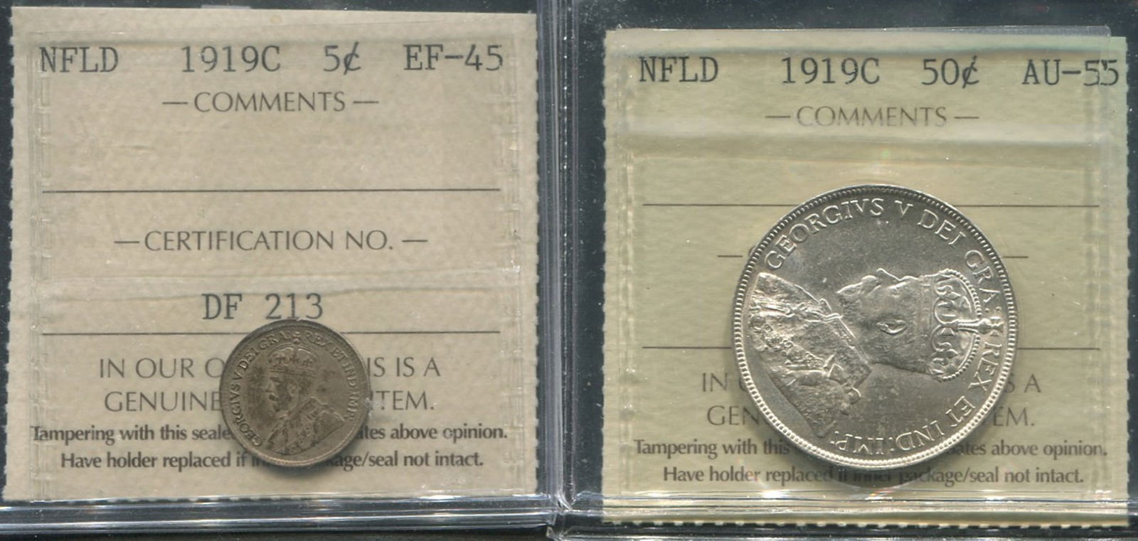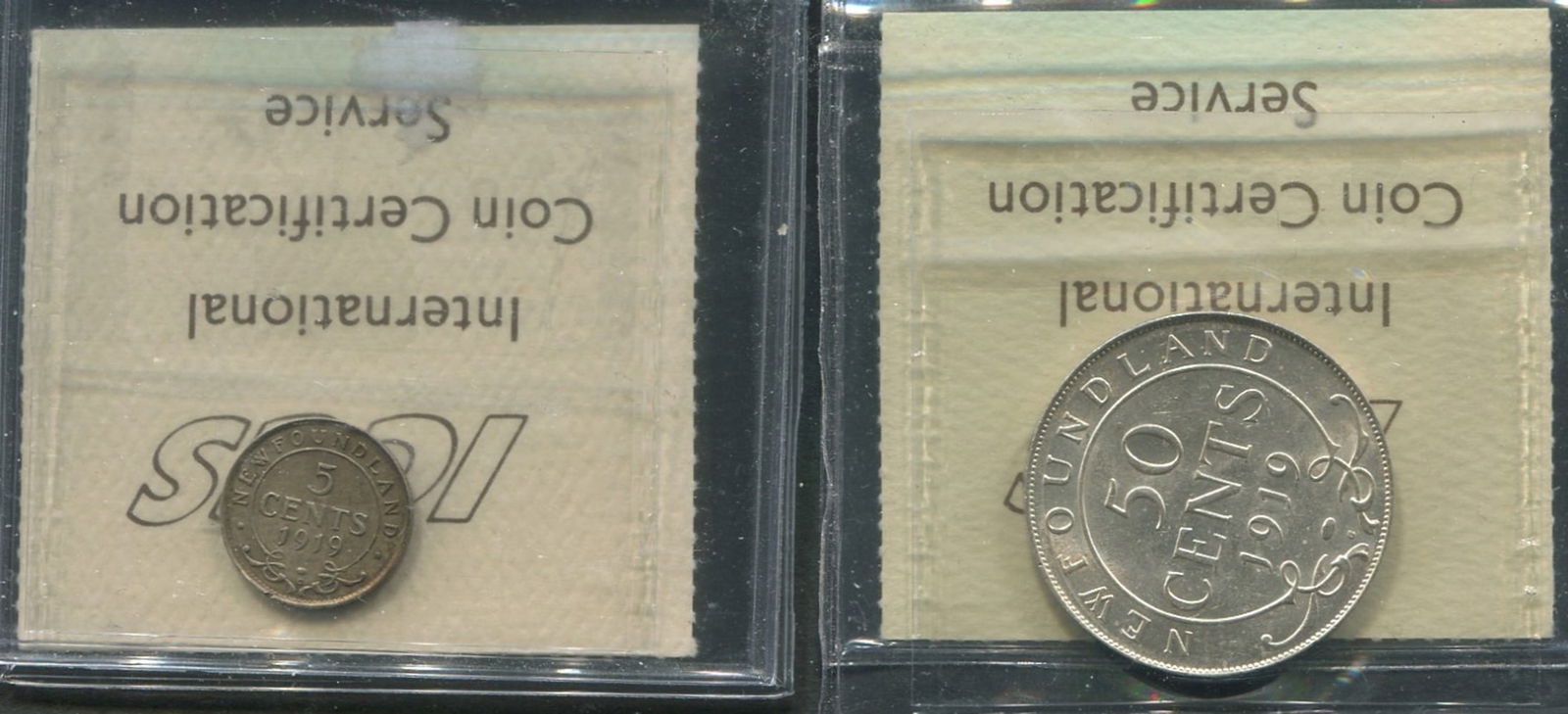 This lot consists of 2 Newfoundland coins, 1919C 5 cents (ICCS -EF45), 1919C 50 cents (ICCS AU-55)The 50 cents has great eye appeal, the entire crown is very distinct, and overall conservatively graded. (Image 1)