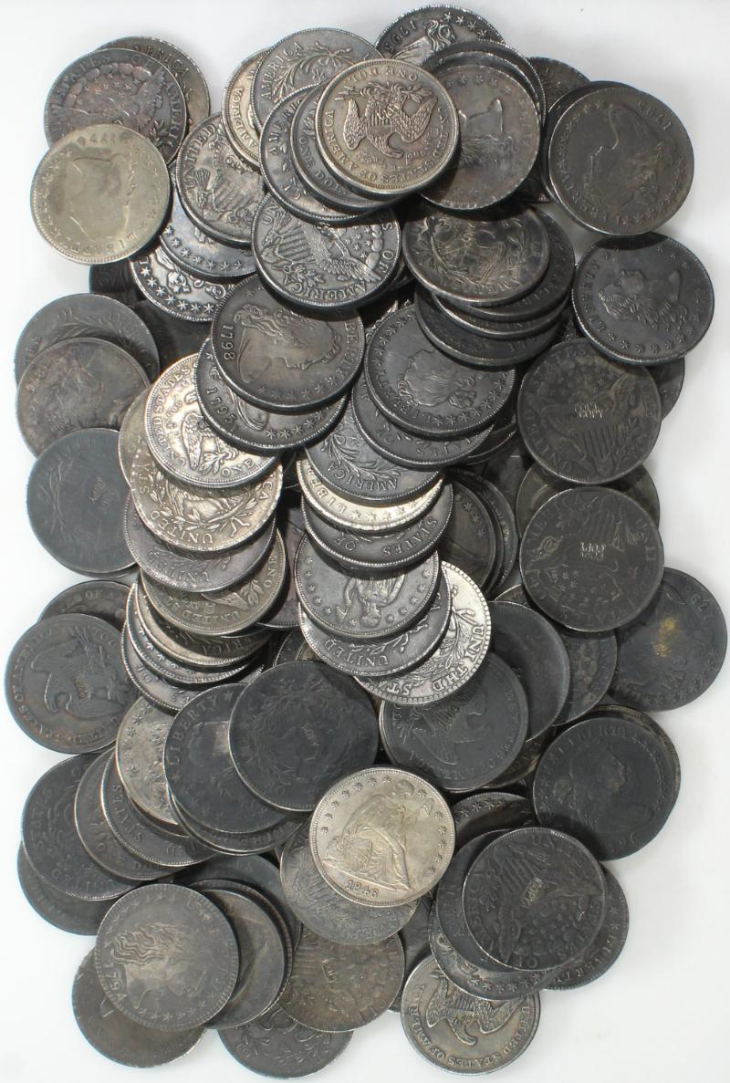 (300+) replicas of US Flowing Hair, Draped Bust, and Seated Dollars all marked "COPY" and not intended to deceive prospective buyers. Quality imitations, incl some very rare specimens. Needs review! (Image)