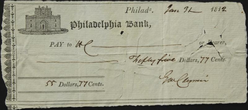 1812 Check for $55.77 from Philadelphia Bank, signed by George Clymer, president of the bank, also a Founding Father, one of only six men to have signed both the Declaration of Independence and the Constitution; cross-shaped slit cancels, F-VF (Image)