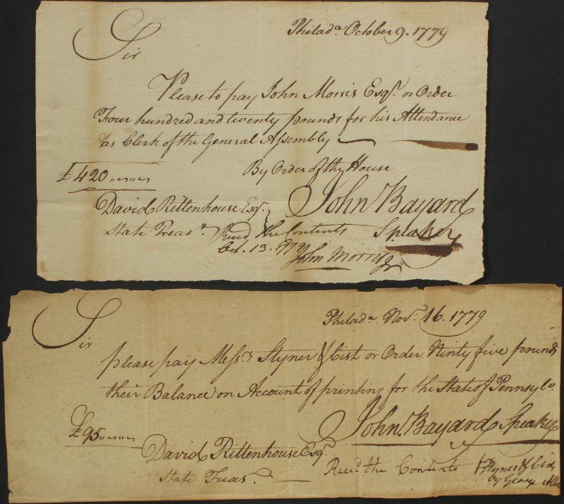 (3) U.S. Mint Director autographs; (2) diff payment orders for the State of Pennsylvania, both handwritten at Philadelphia in 1779, both signed by state treasurer and future Mint Director David Rittenhouse as well as state speaker John Bayard, one in October as payment for clerk of the General Assembly (£420) , the other in November for printing services (£95); 1804 folded letter, handwritten & signed by 3rd Mint Director Elias Boudinot, land related content; wax seal torn off; typical foxing, signatures strong, F-VF (Image)