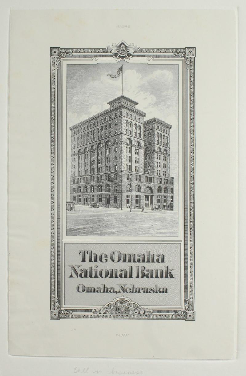 Sunken die engraved proof of The Omaha National Bank building, flag on top, streetcar & early autos in the scene; from the American Bank Note Co. archives, proof #V-18207; the building still stands; VF (Image)